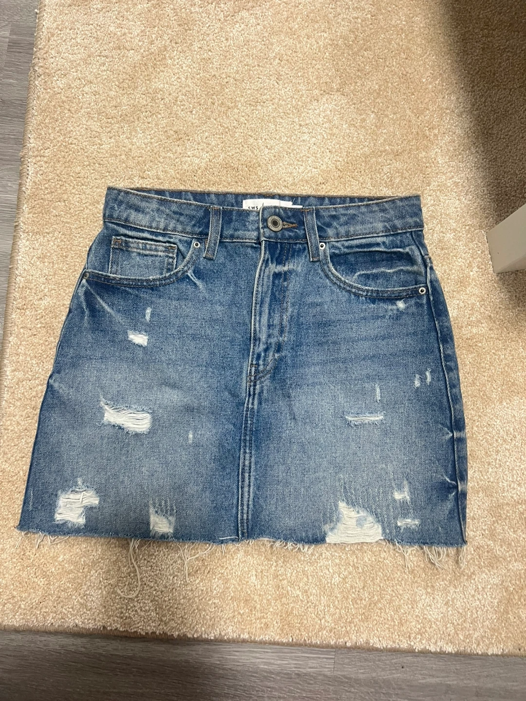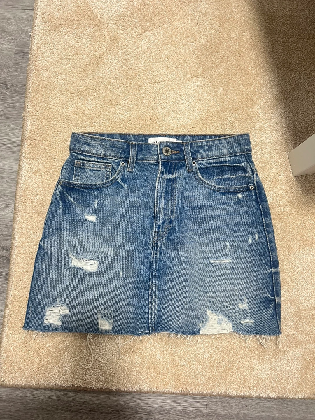 This is a light wash denim skirt from DENIM CO. It's made from 100% organic cotton. The skirt has a distressed look with rips and raw hem. Size S. Perfect for casual wear!