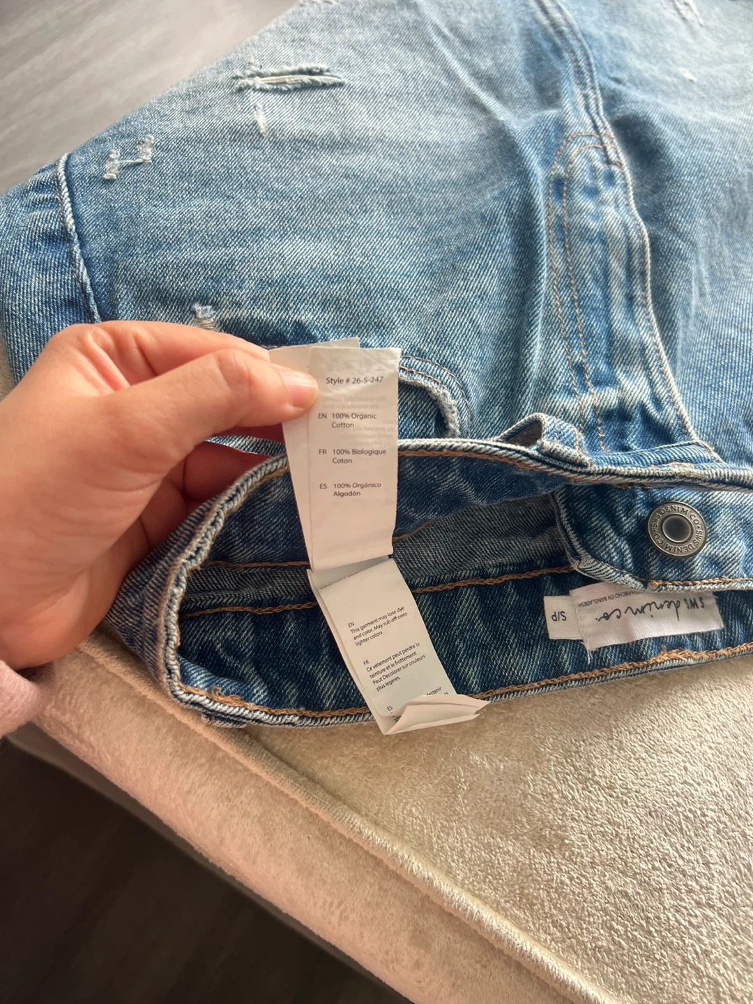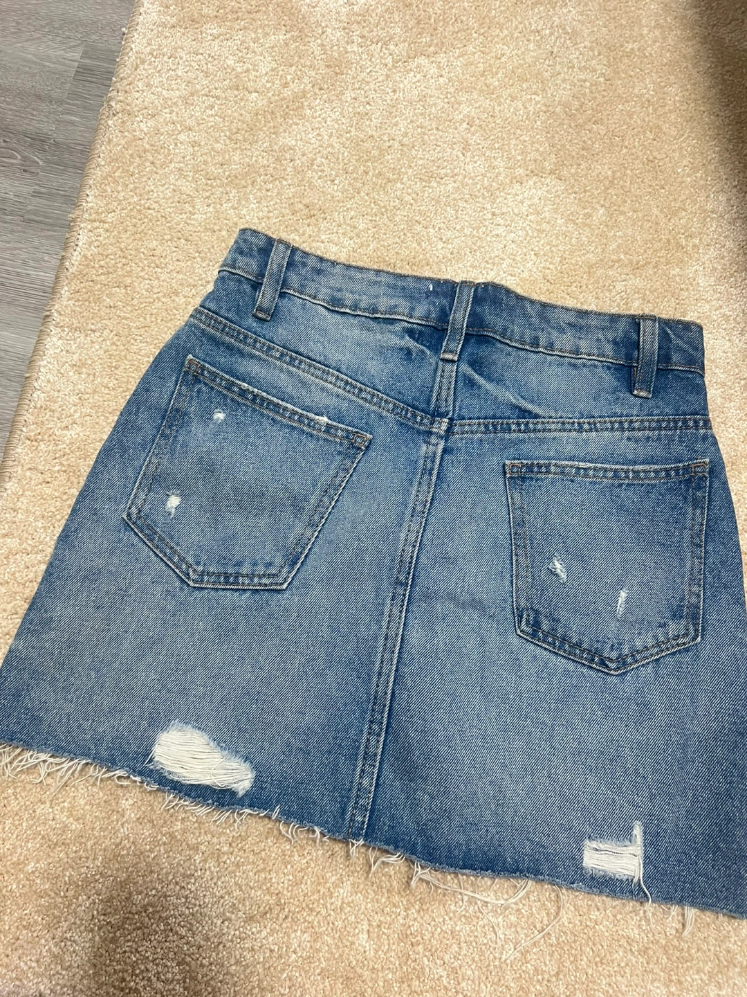 This is a light wash denim skirt from DENIM CO. It's made from 100% organic cotton. The skirt has a distressed look with rips and raw hem. Size S. Perfect for casual wear!