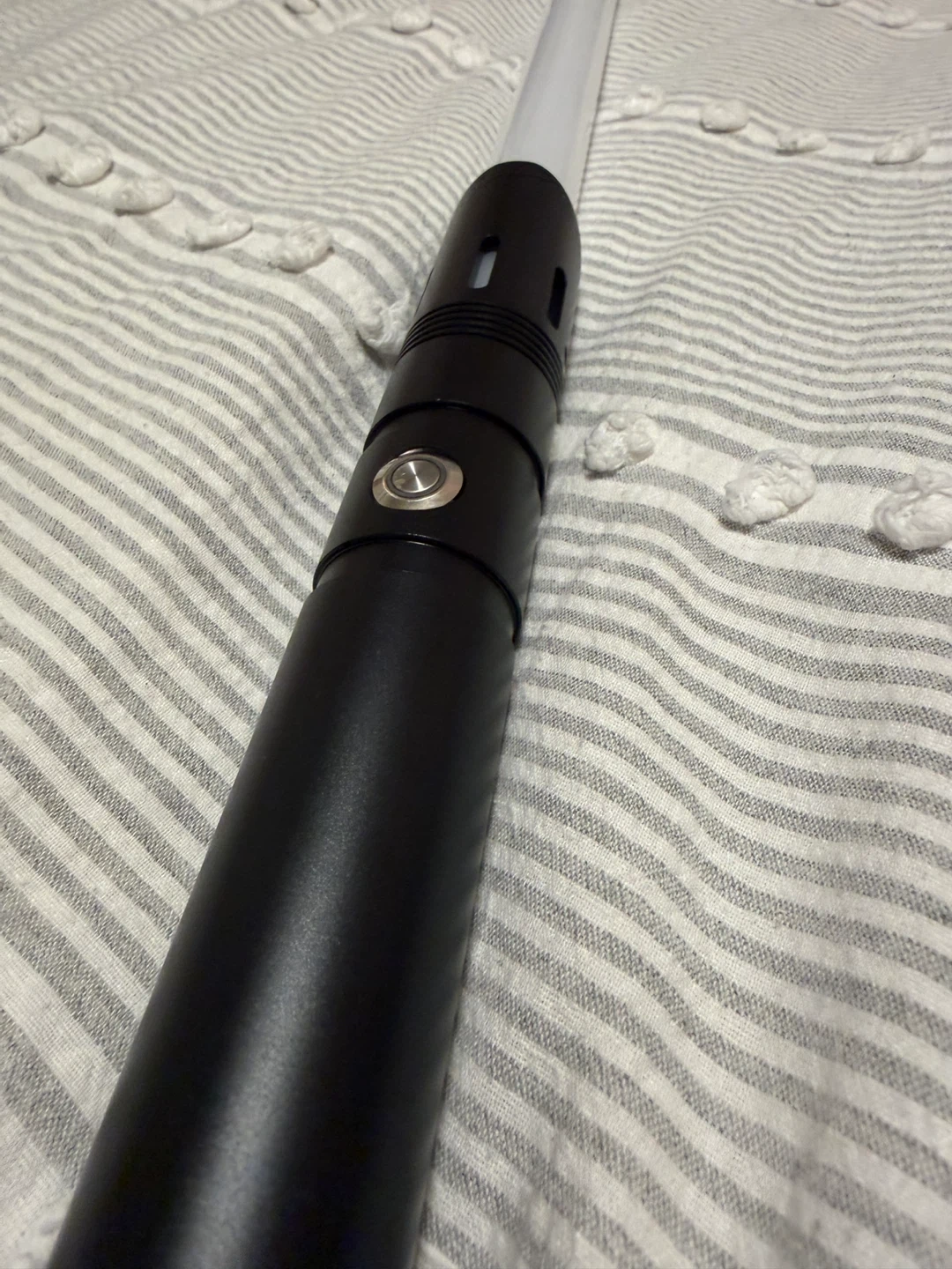 This is a black lightsaber with a rechargeable battery included. It has a USB-C charging port. The blade is translucent white.