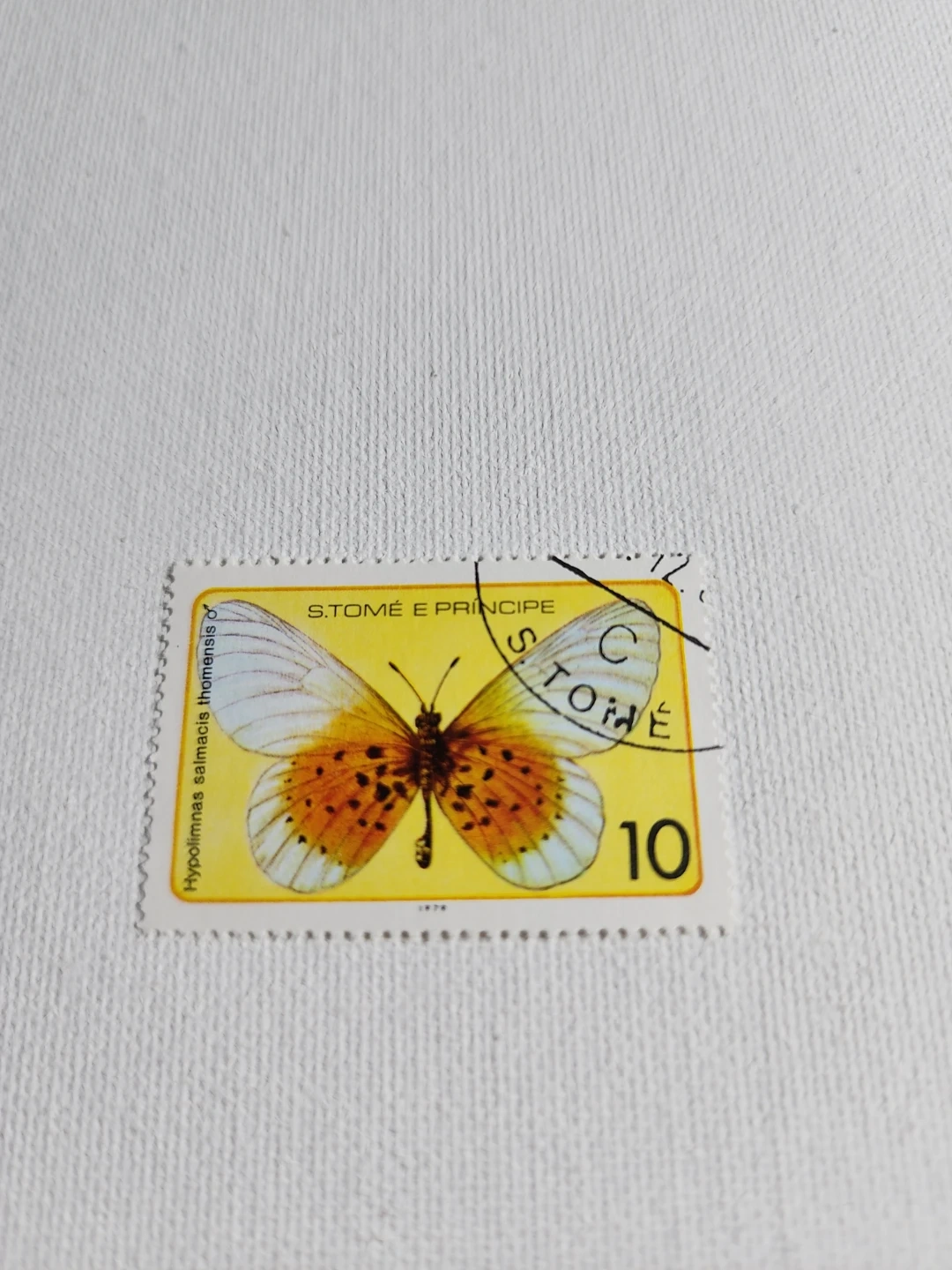 S.Tomé e Principe stamp with a butterfly design. The stamp has a yellow background and features a butterfly with white and orange wings.