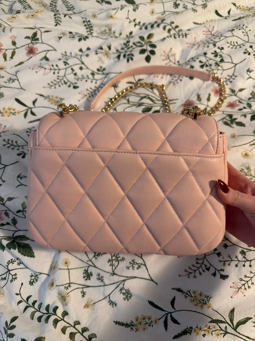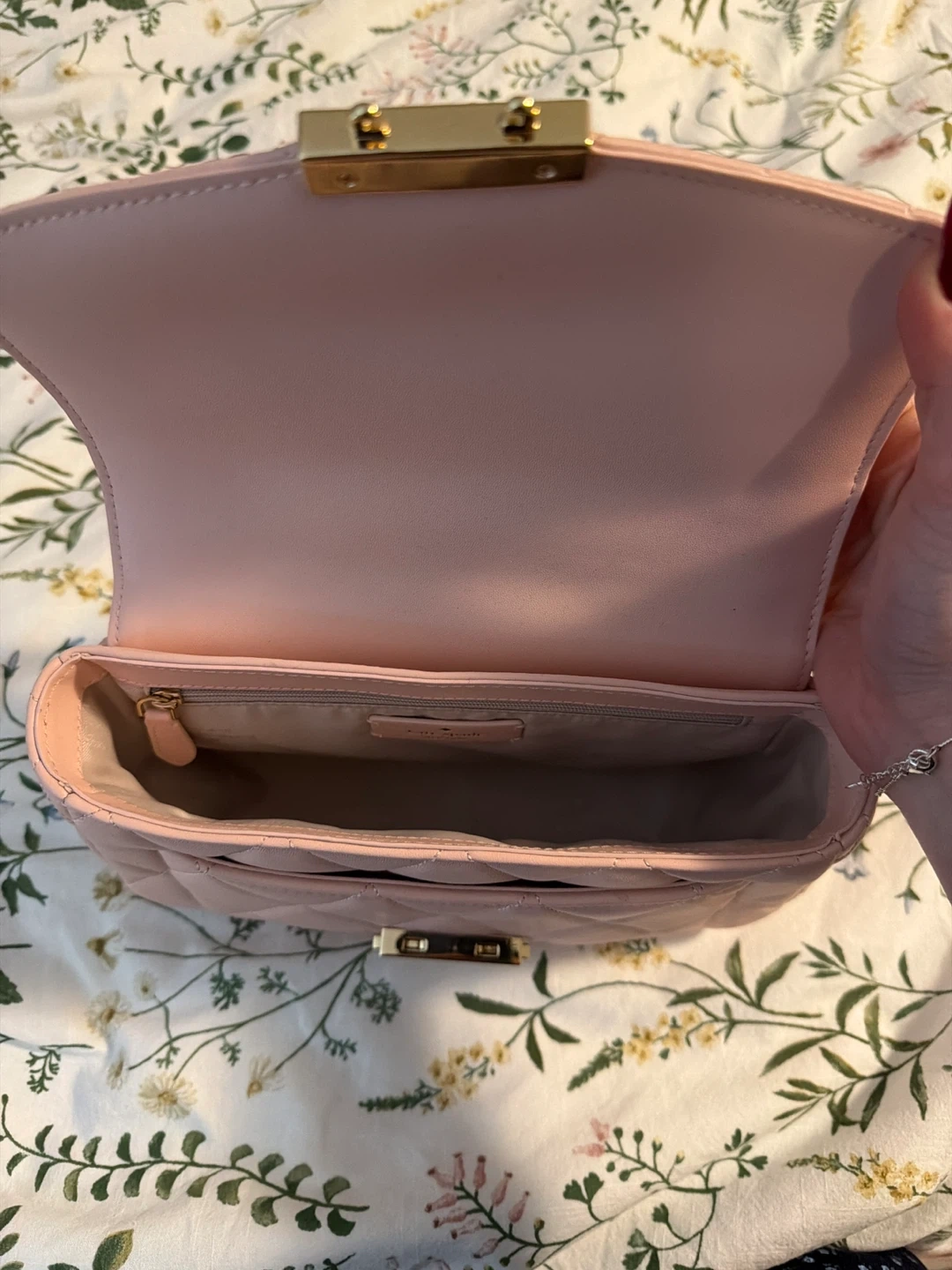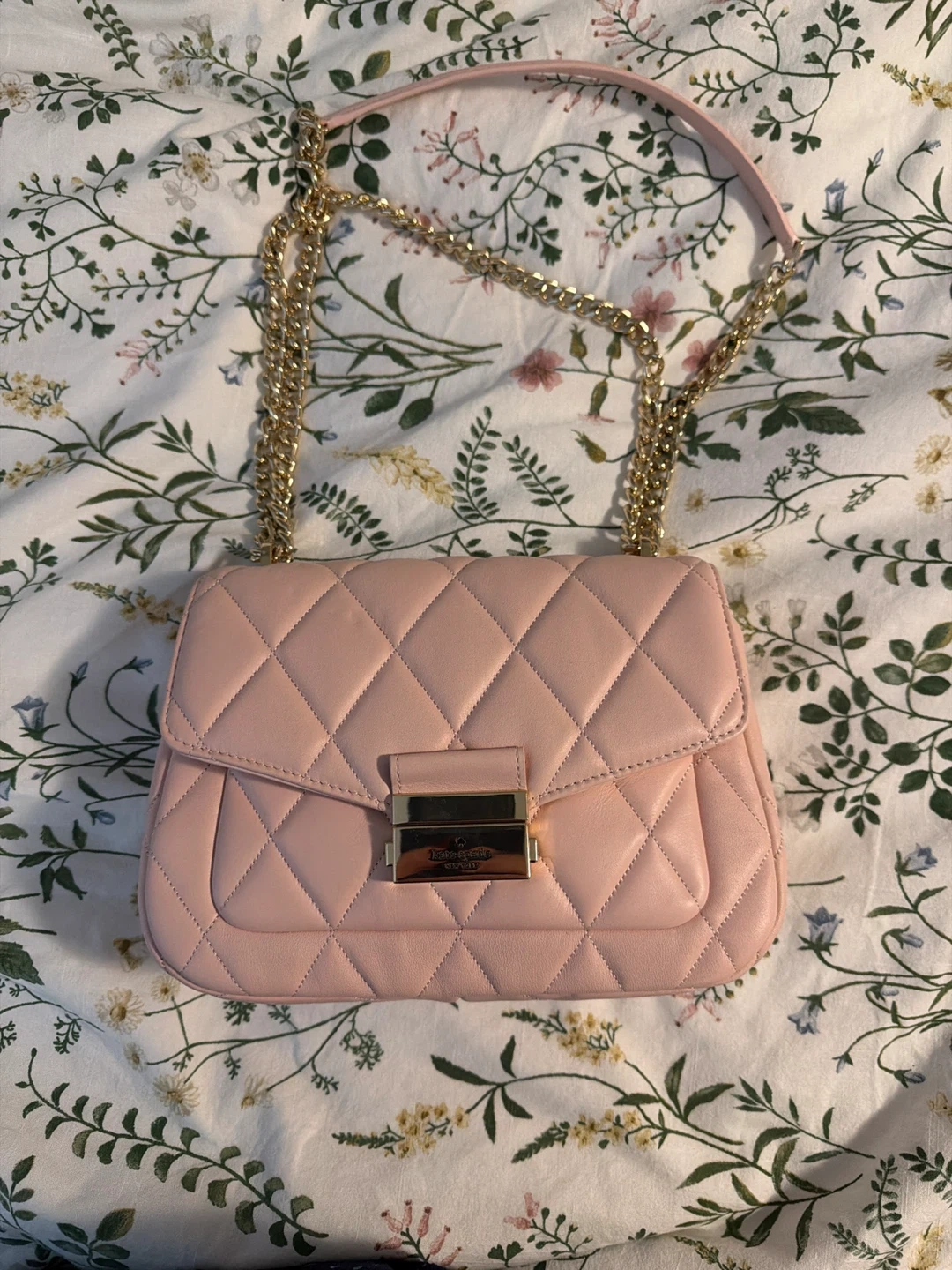 This is a light pink quilted shoulder bag from Kate Spade. It features a gold turn-lock closure and a chain strap. It's a stylish accessory for any occasion!