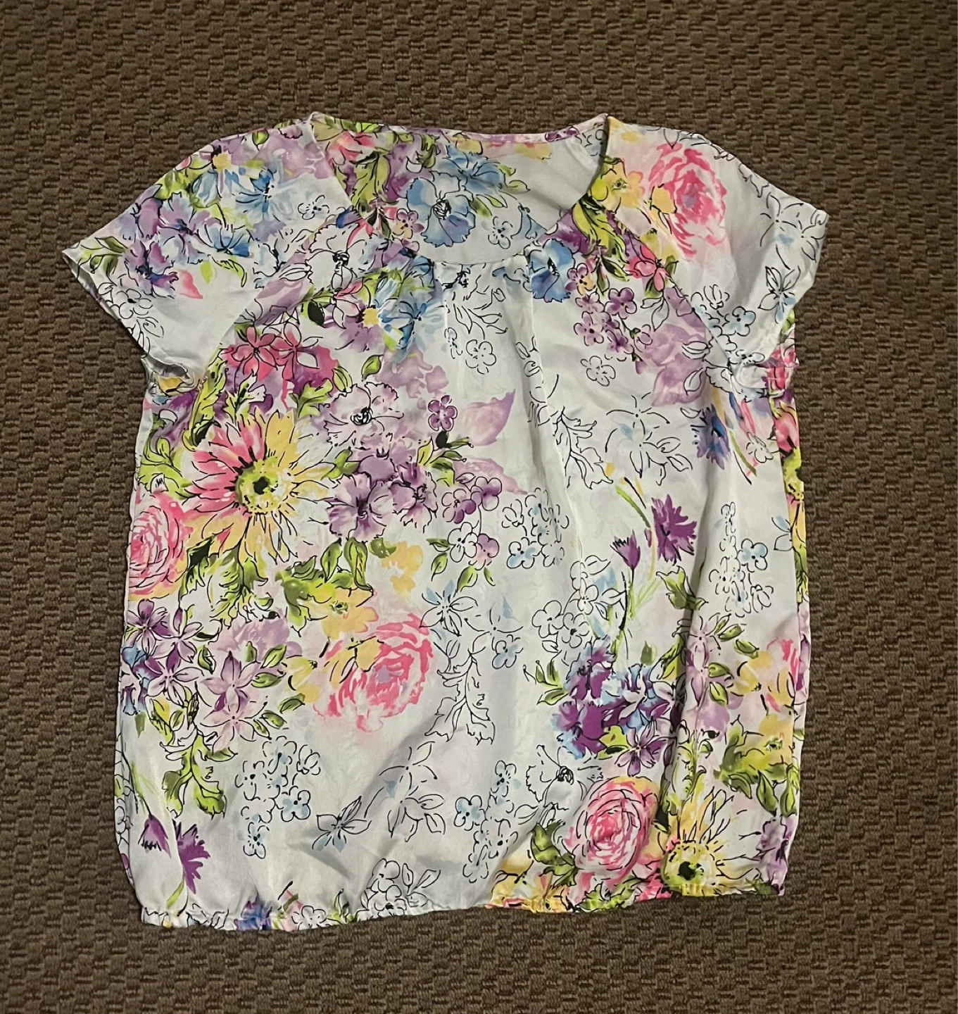 A breezy white top with a vibrant floral print. It's made from a lightweight fabric with short sleeves. Perfect for warm weather days!