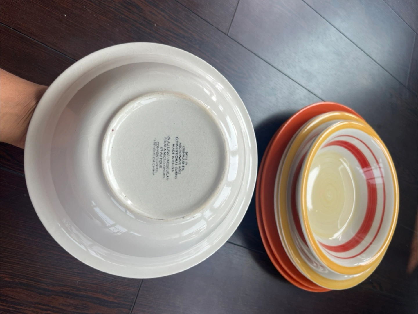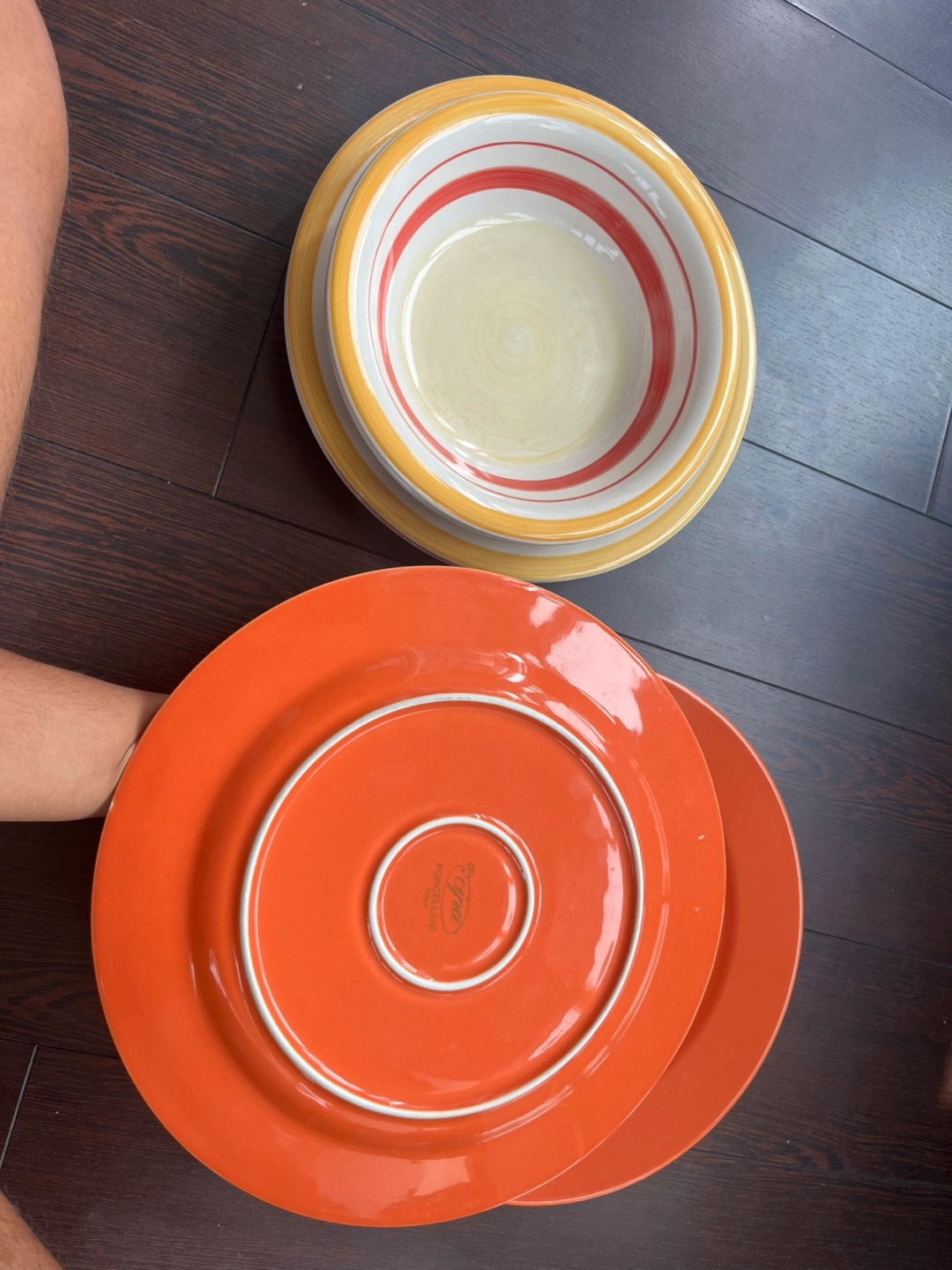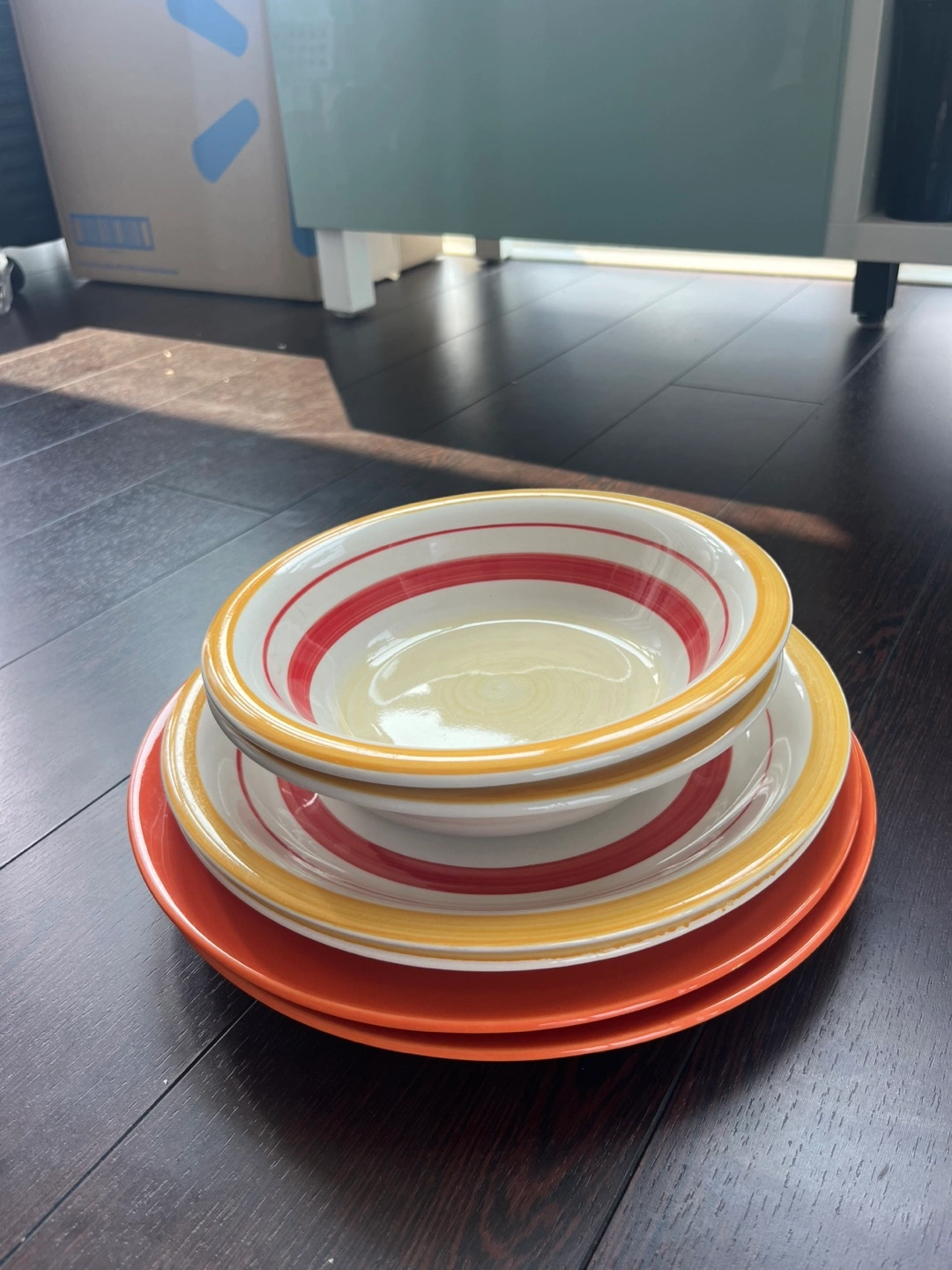 Beautiful orange and yellow dish set - 2 large orange plates, 2 medium striped plates and 2 wide bowls