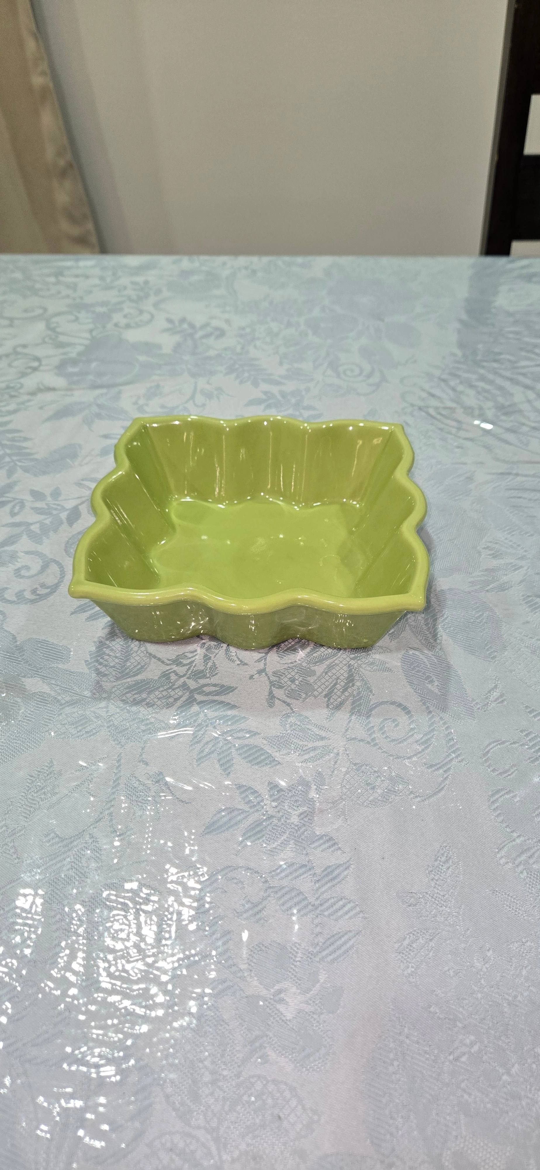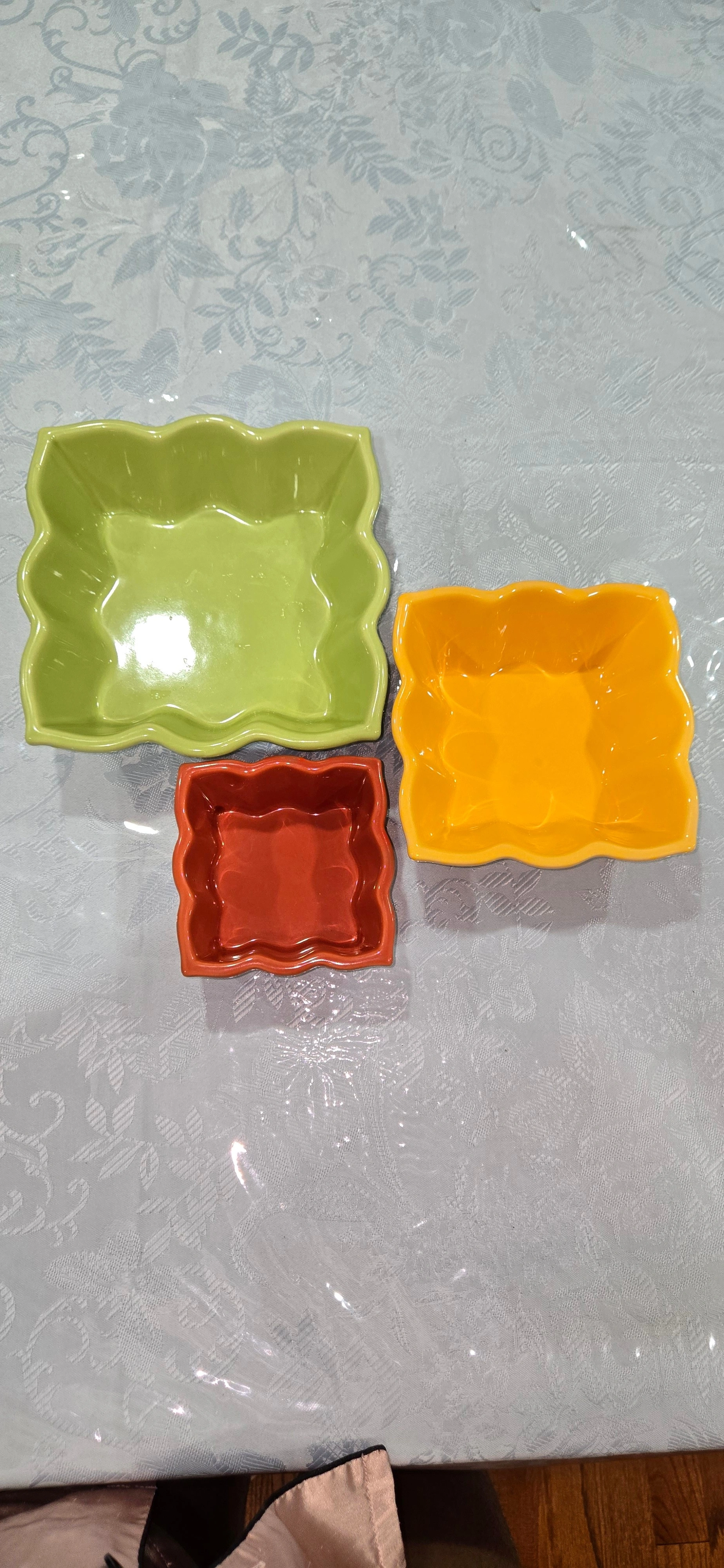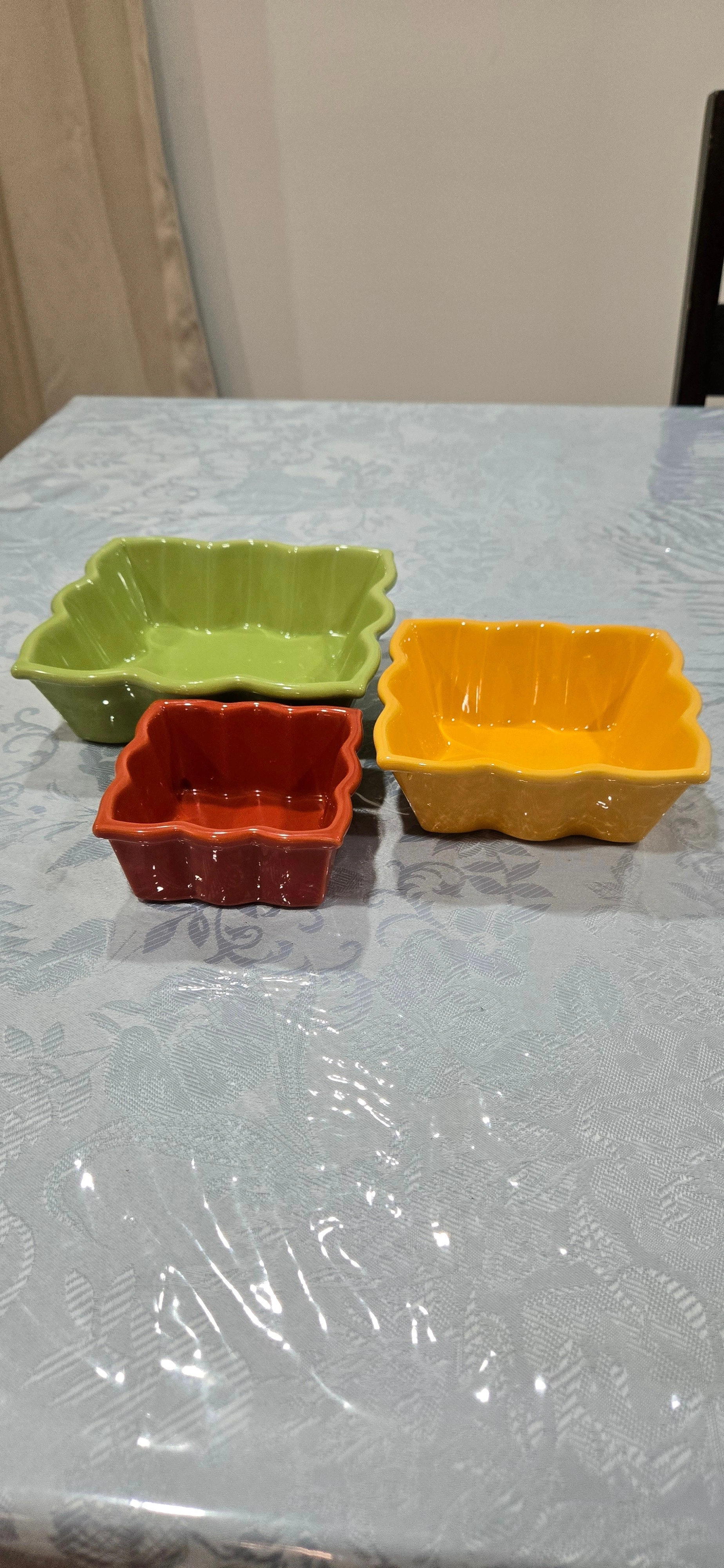 The set includes three square, wave-edged ceramic baking dishes in green, orange, and red colors.