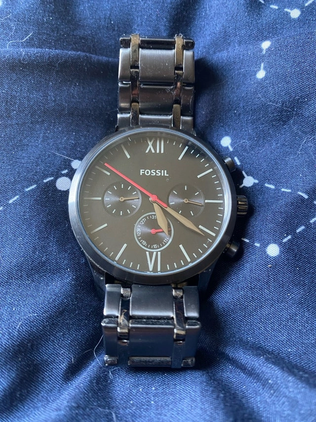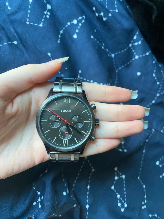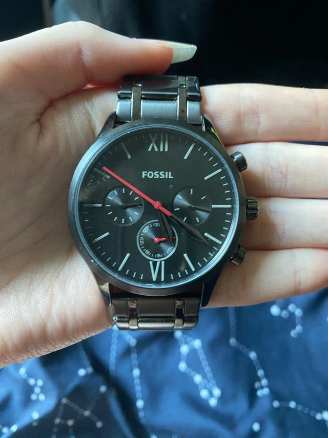 Sleek and stylish Fossil stainless steel watch in great condition. Lightly worn with minimal signs of use. Stainless steel case and band. Face is clean with no scratches. Currently not running – just needs a new battery. Classic black dial with silver-tone markers and red accent second hand, plus subdials. Perfect everyday watch or a great addition to any collection. Simple battery replacement and it’s ready to go! Feel free to message with any questions.