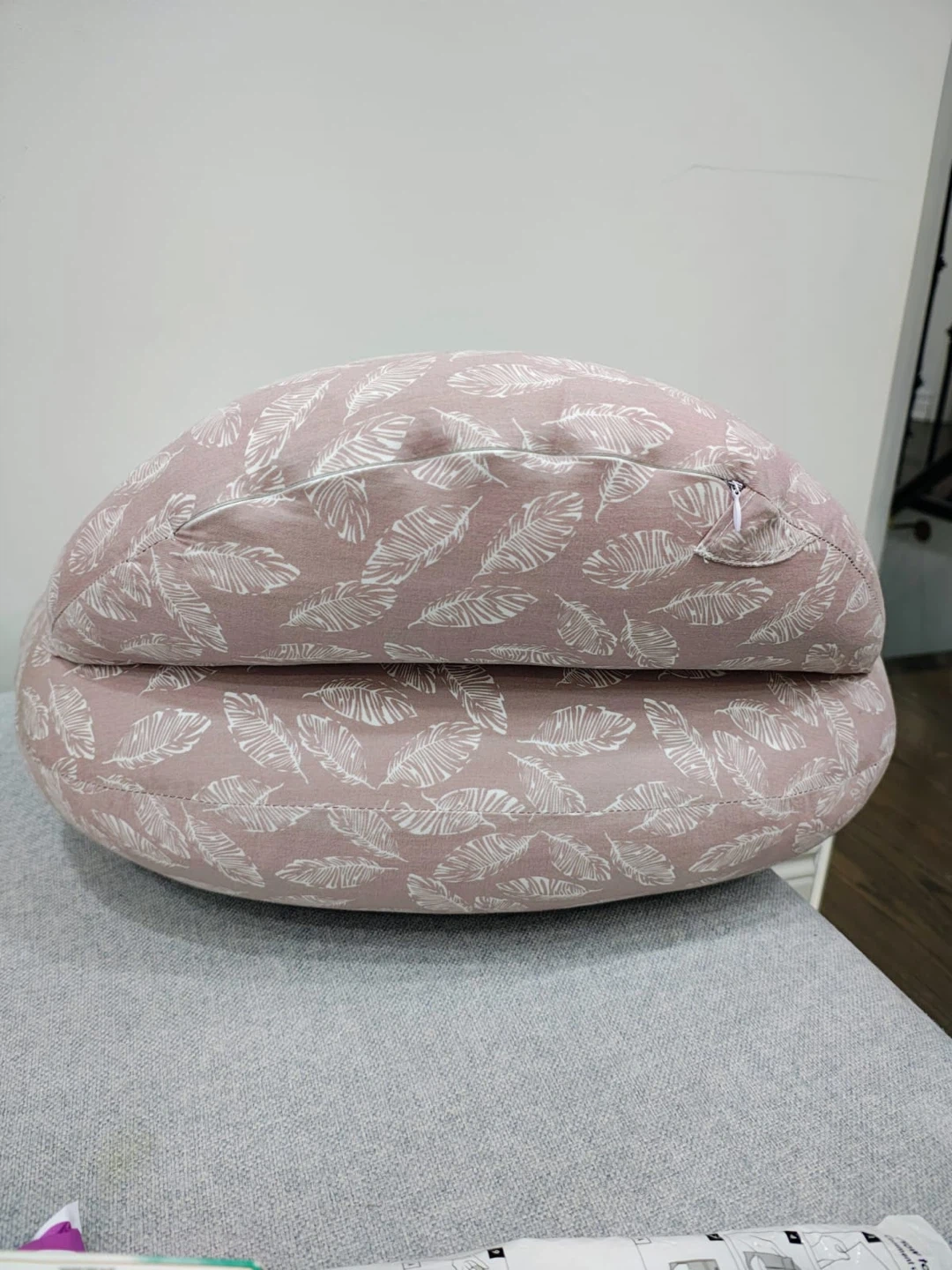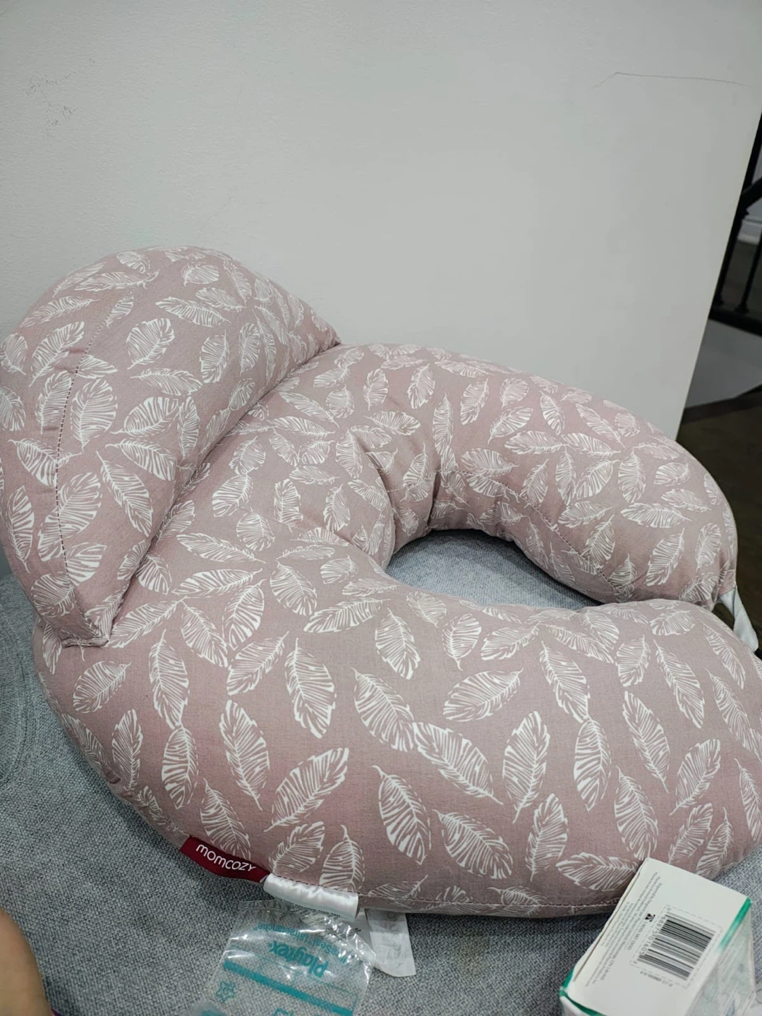 This is a Momcozy nursing pillow with a pink leaf pattern. It's designed for comfort during feeding. The pillow has a soft, removable cover.