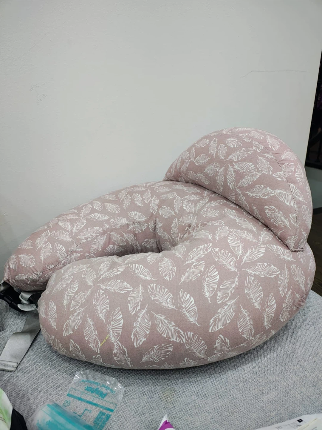 This is a Momcozy nursing pillow with a pink leaf pattern. It's designed for comfort during feeding. The pillow has a soft, removable cover.