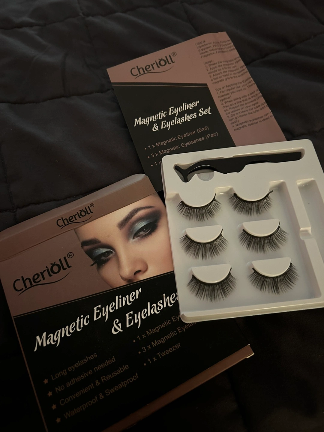 This is a Cherioll Magnetic Eyeliner & Eyelashes Set. It includes 3 pairs of magnetic eyelashes, and 1 tweezer. The eyelashes are long, don't require adhesive, and are waterproof and sweatproof. NO MAGNETIC LINER INCLUDED.