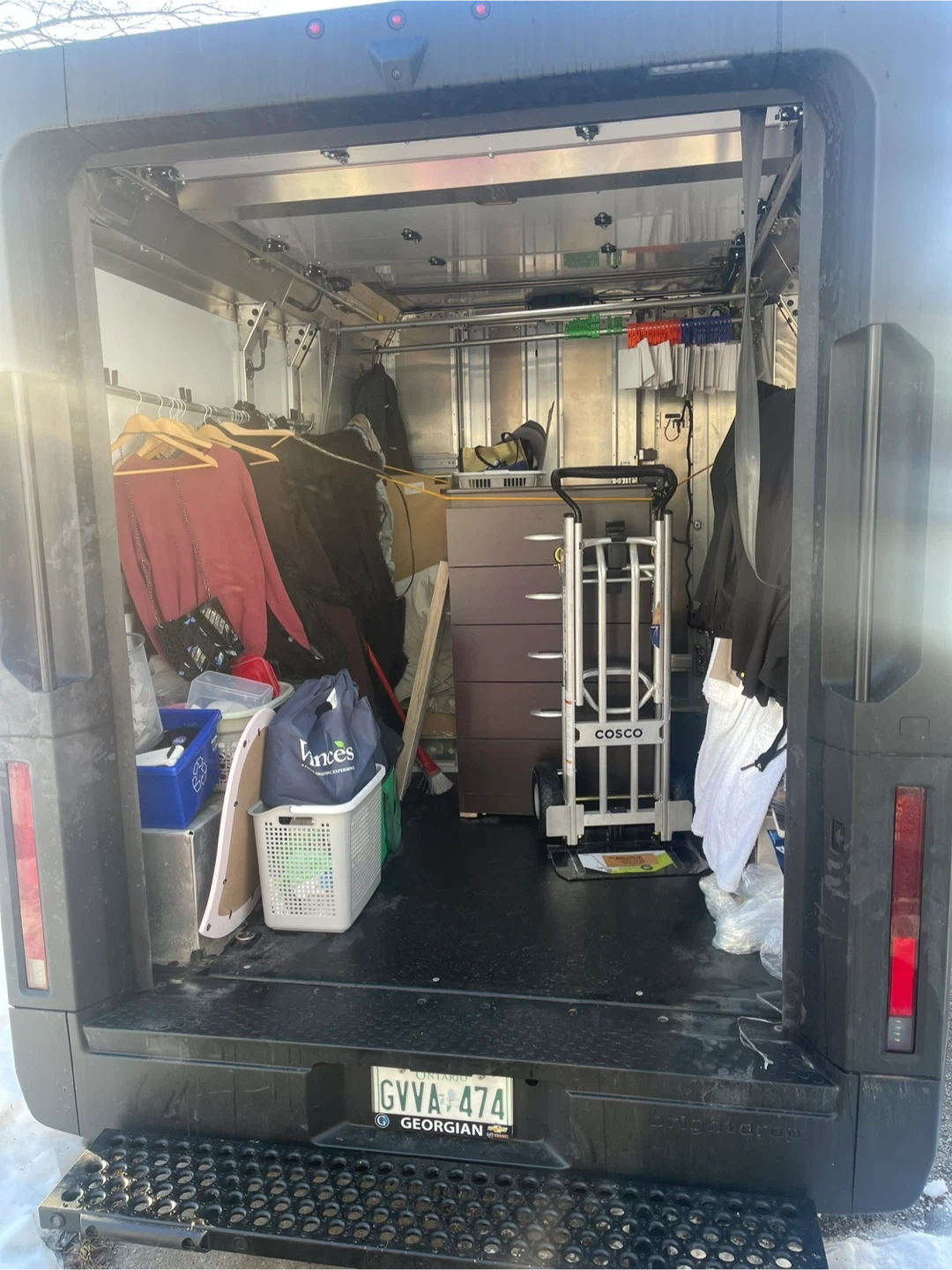 This is a delivery van packed with various items, including furniture, household goods, and personal belongings. It's ready for transport or storage! The van appears to be a commercial model designed for cargo.