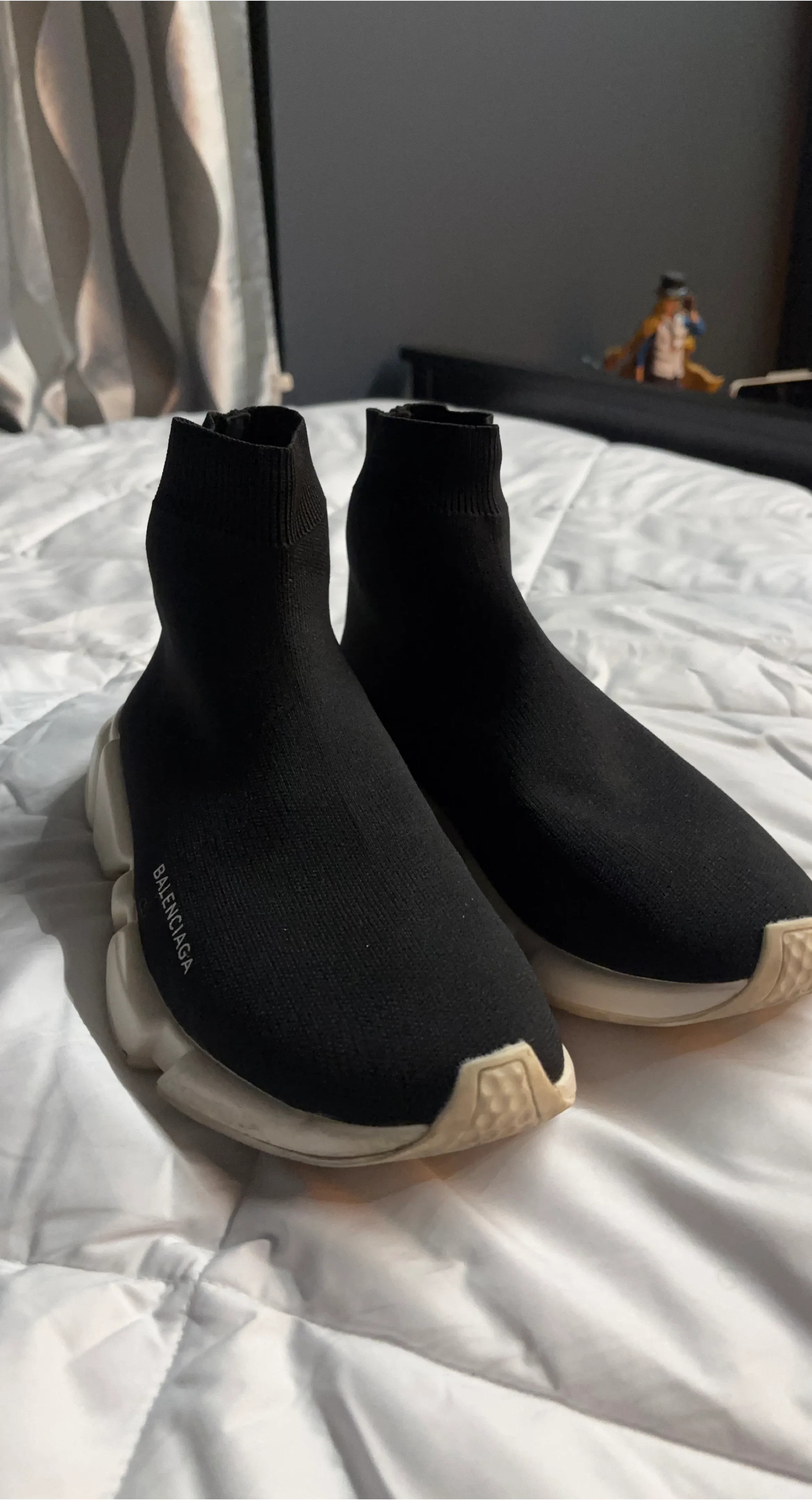 Selling a pair of Balenciaga Speed 2.0 sneakers in black! These are a sock-style sneaker with a knit upper and chunky sole. Barely any signs of wear on the soles, it’s a little dirty , but the upper is in great shape.
