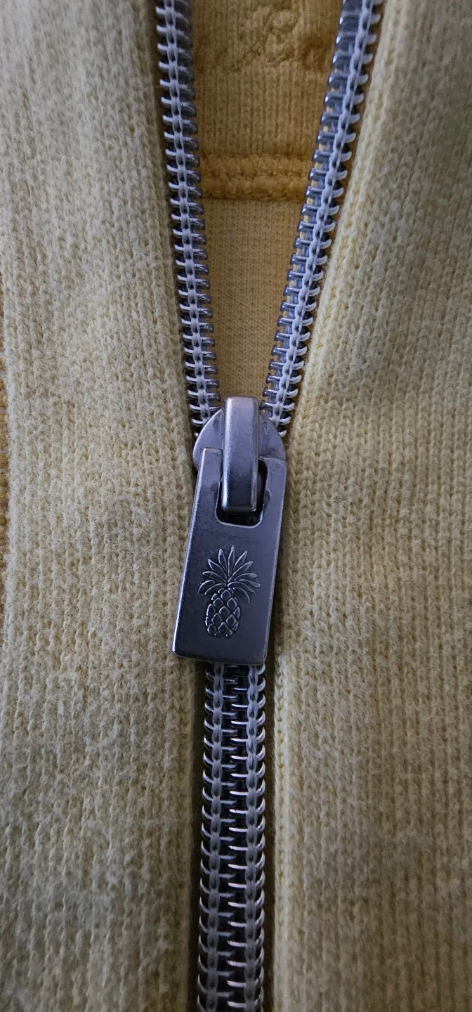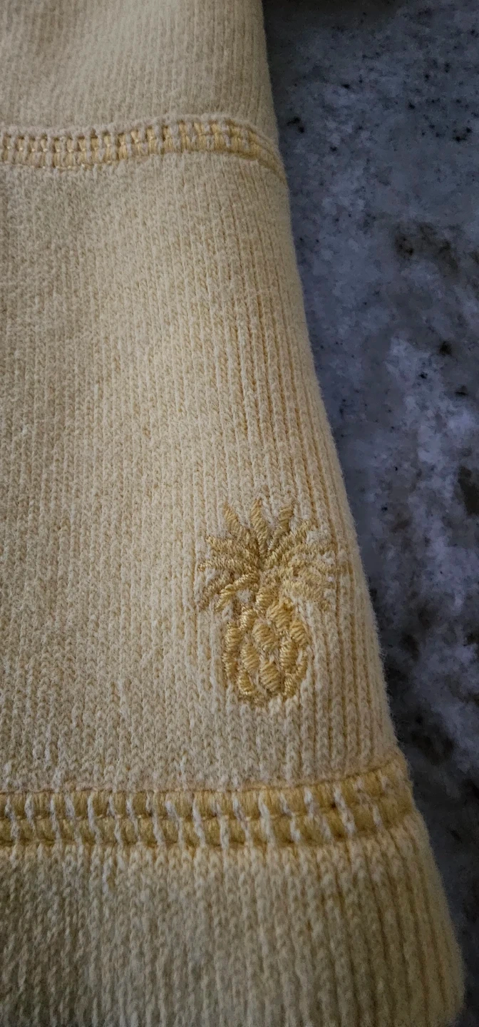 Tommy Bahama women's yellow sweater. It's a size M/M with a 1/4 zip closure and a small embroidered pineapple detail on the chest and zipper pull. Made with a comfortable knit fabric.
