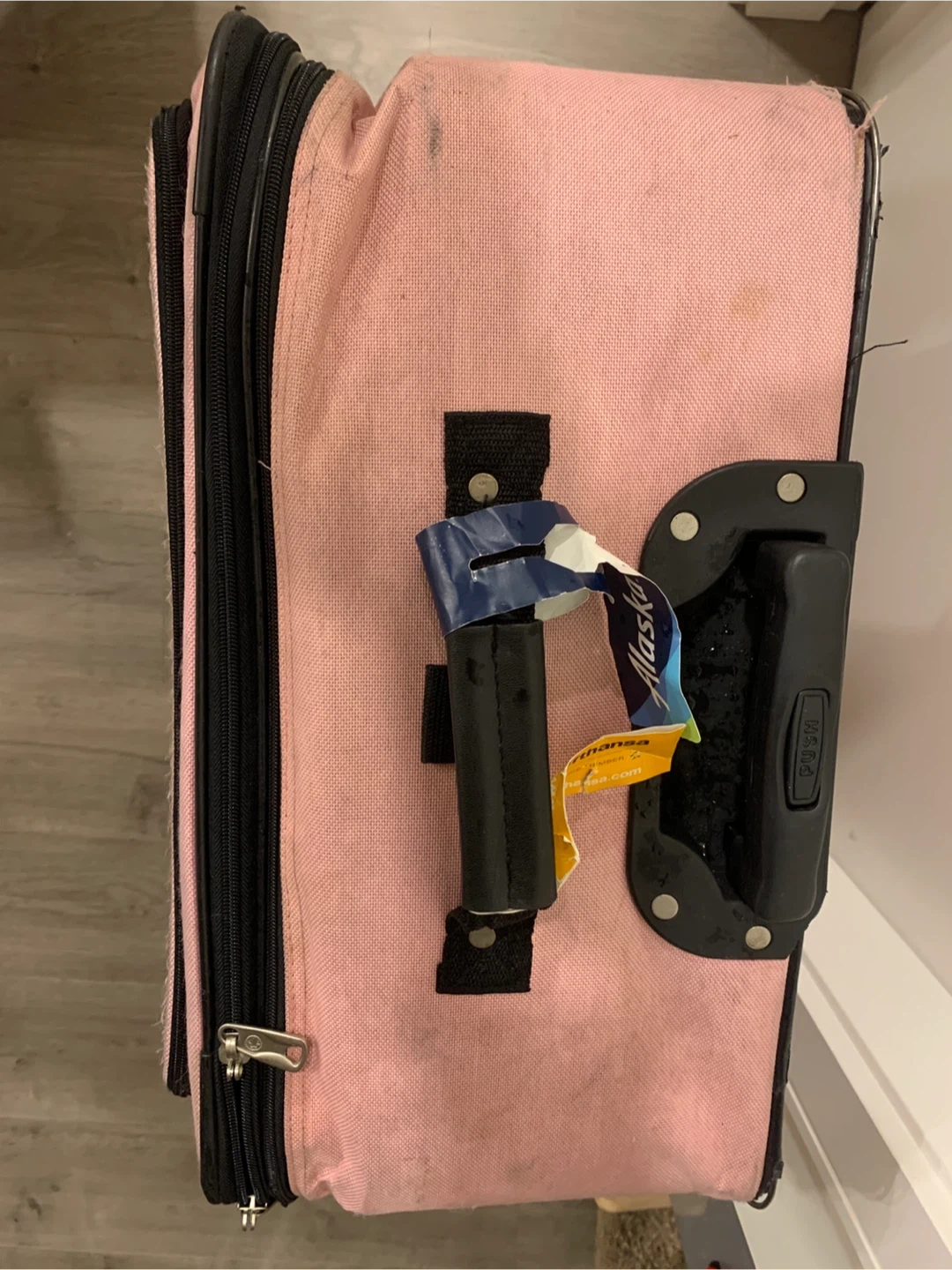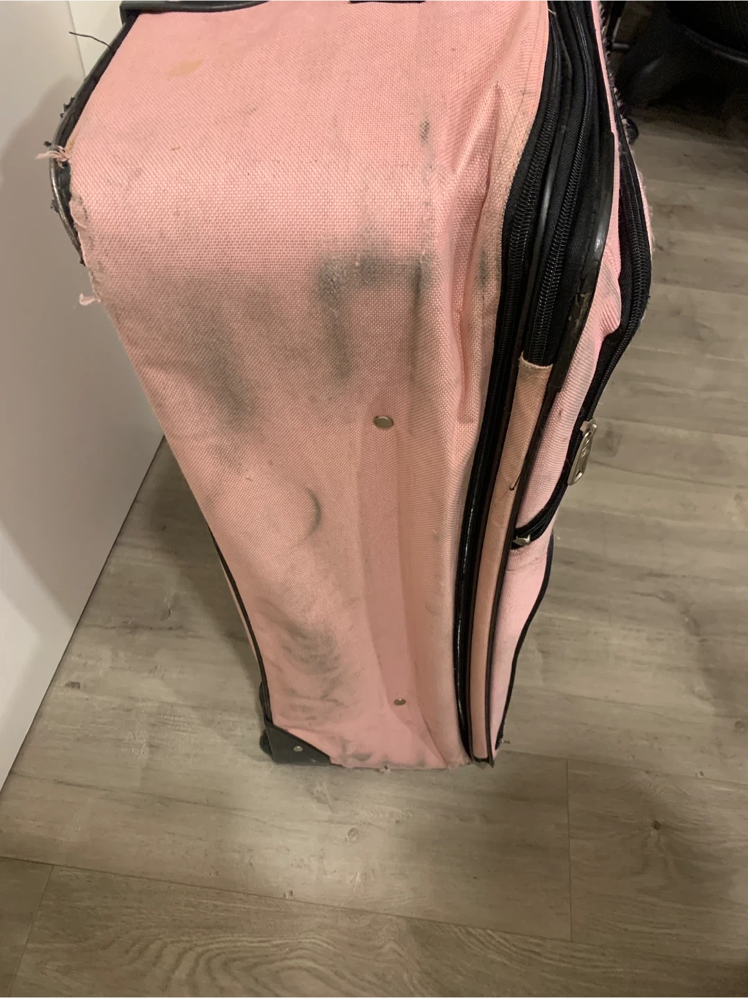 Pink rolling suitcase with black trim and handles. It has multiple zippered compartments. Shows lot of wear with some scuffs and marks from travel. We have been using it for storage now and don’t need it any longer.