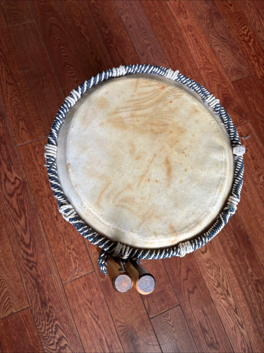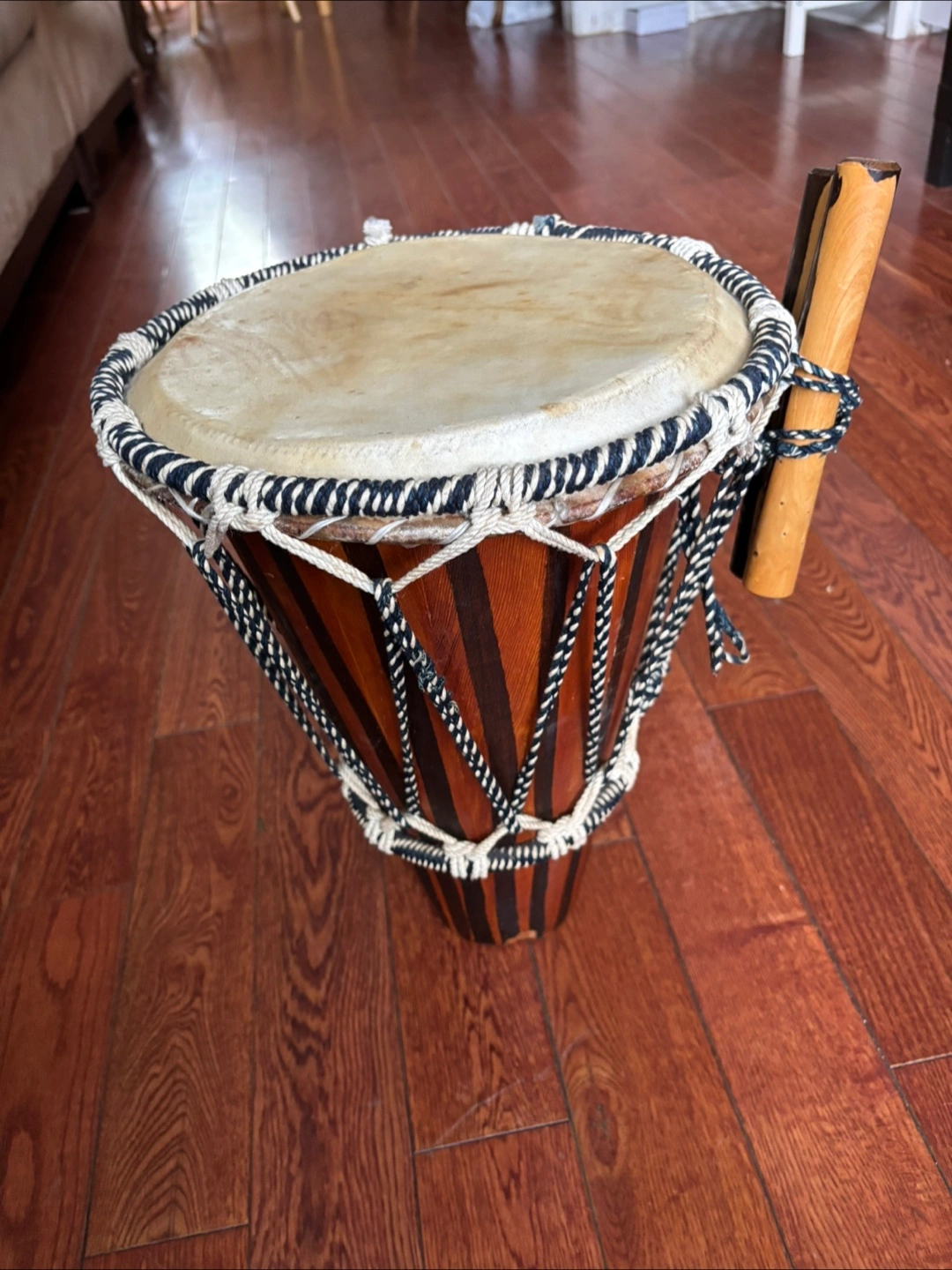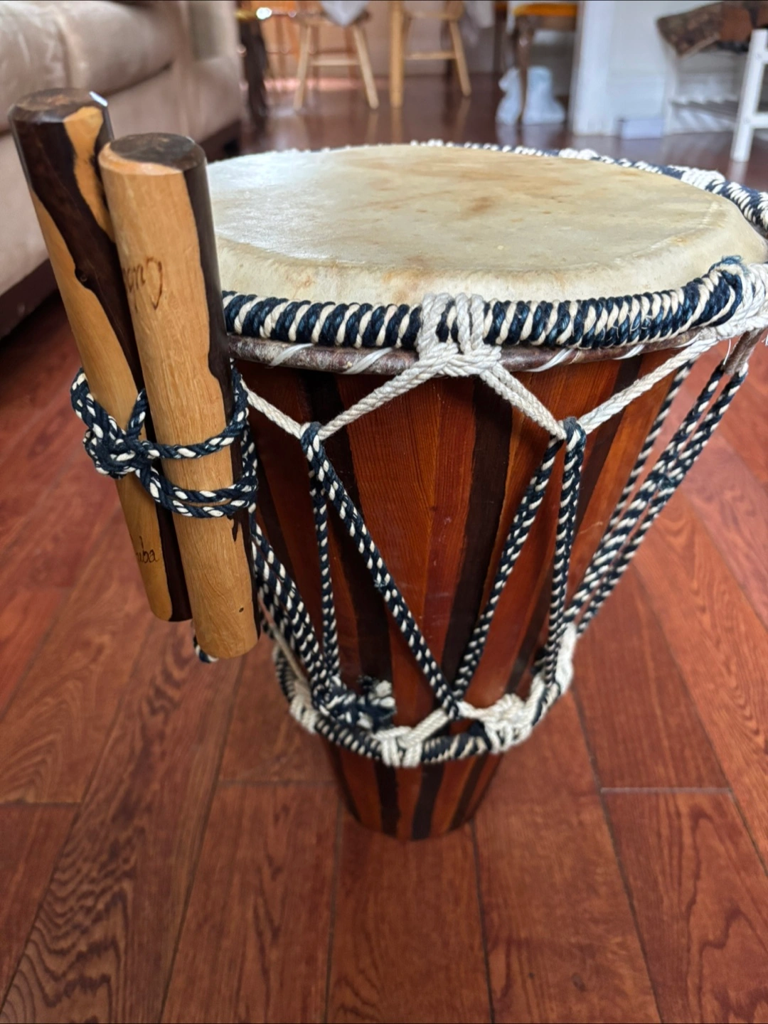 Small hand drum. Wooden body with striped design. Natural coloured drum head. Includes two wooden beaters. Rope lacing around drum.