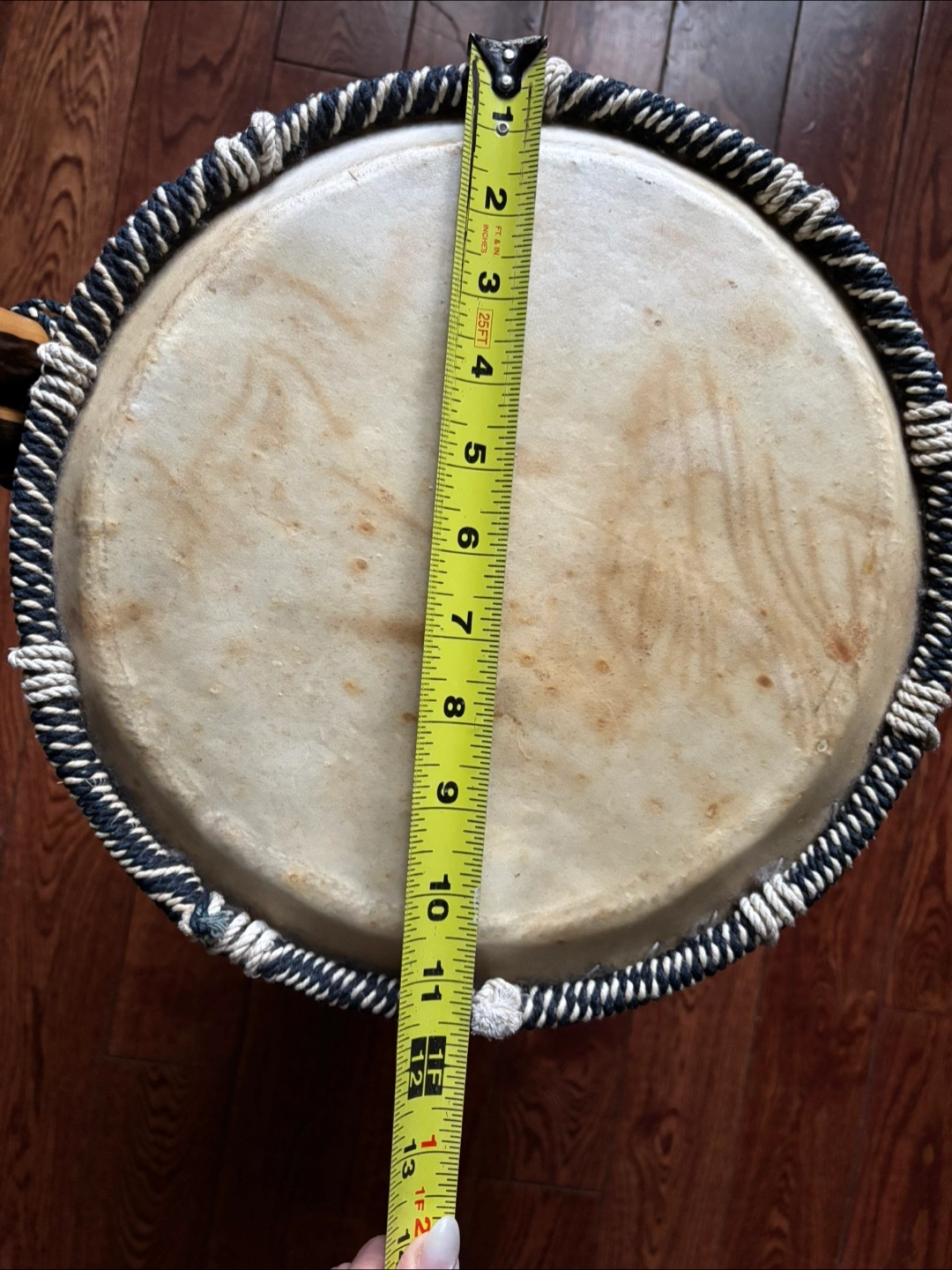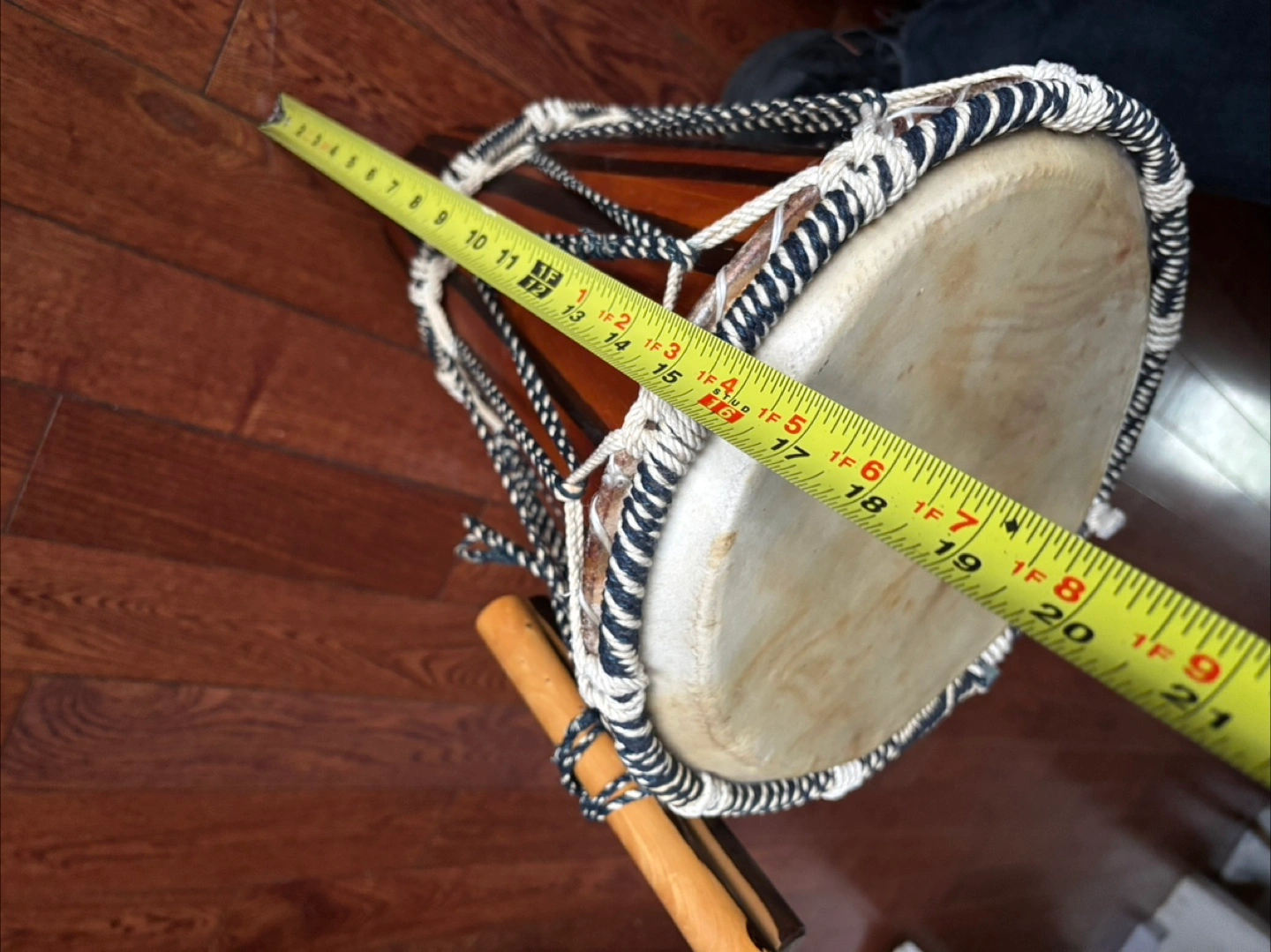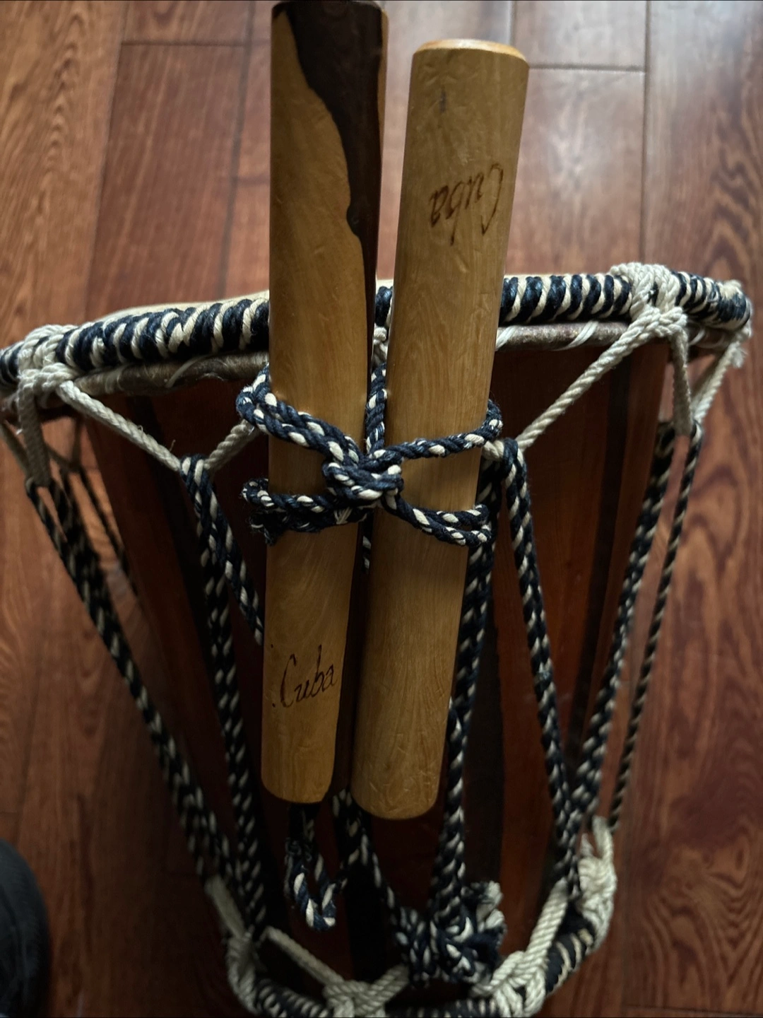 Small hand drum. Wooden body with striped design. Natural coloured drum head. Includes two wooden beaters. Rope lacing around drum.