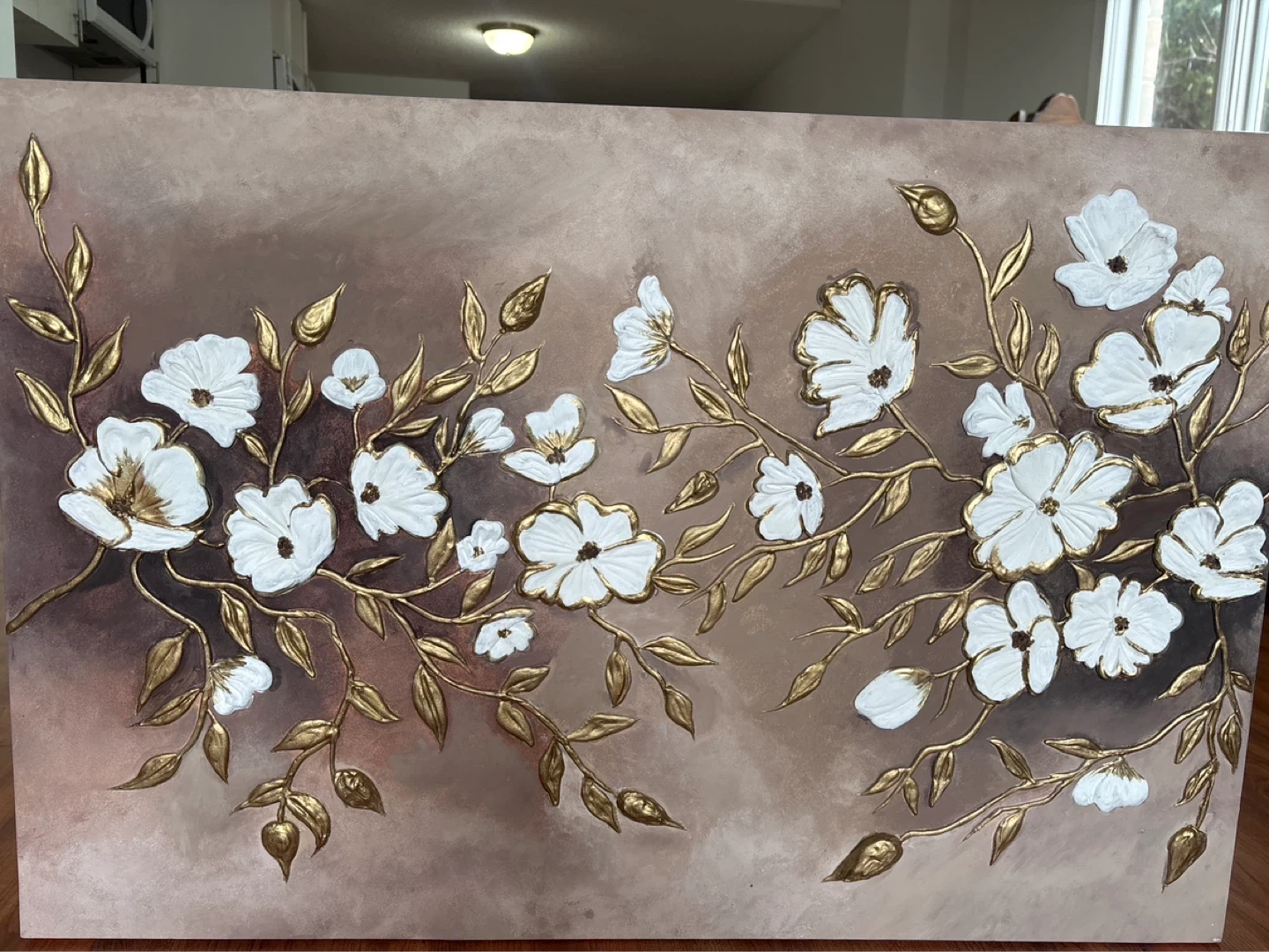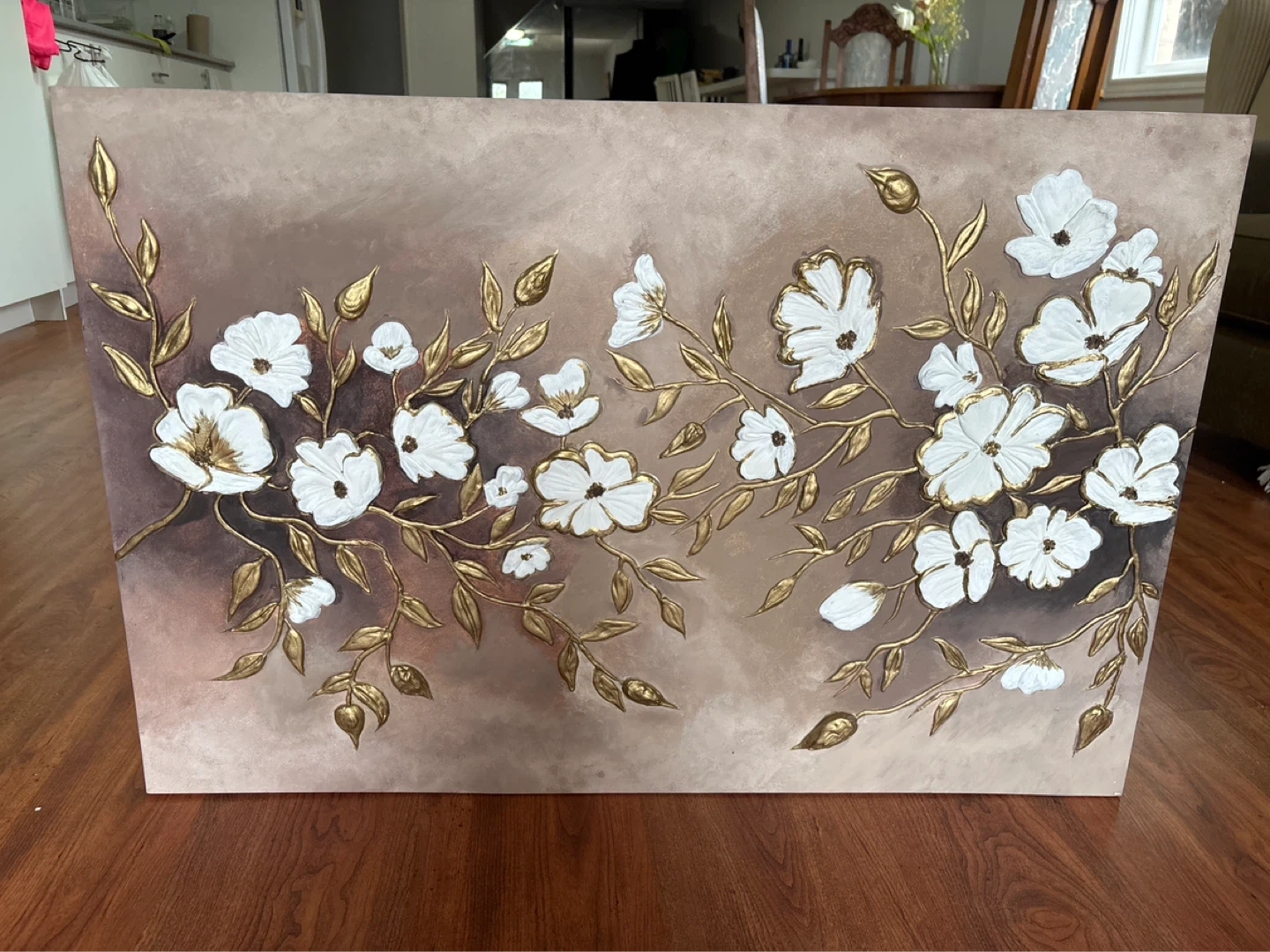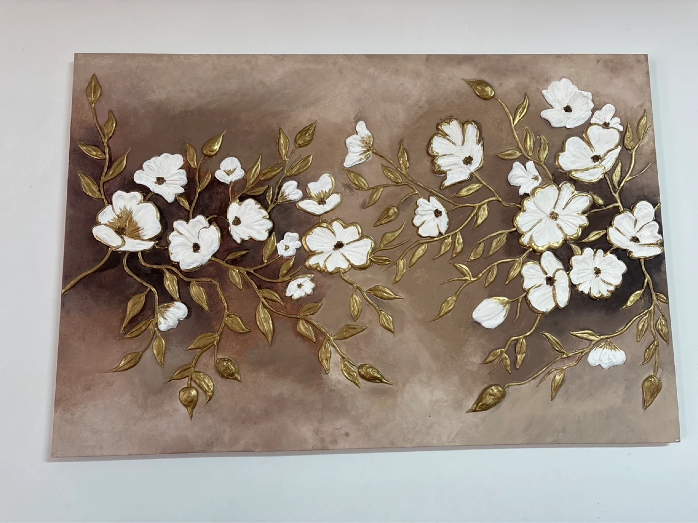 This textured canvas art features delicate white flowers and gold-toned leaves against a taupe background. It's a beautiful piece with a raised, tactile finish. Adds a touch of elegance to any room!