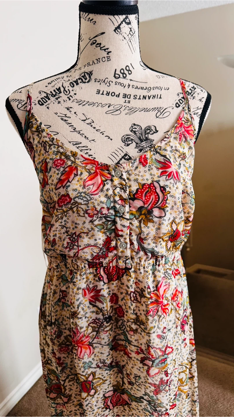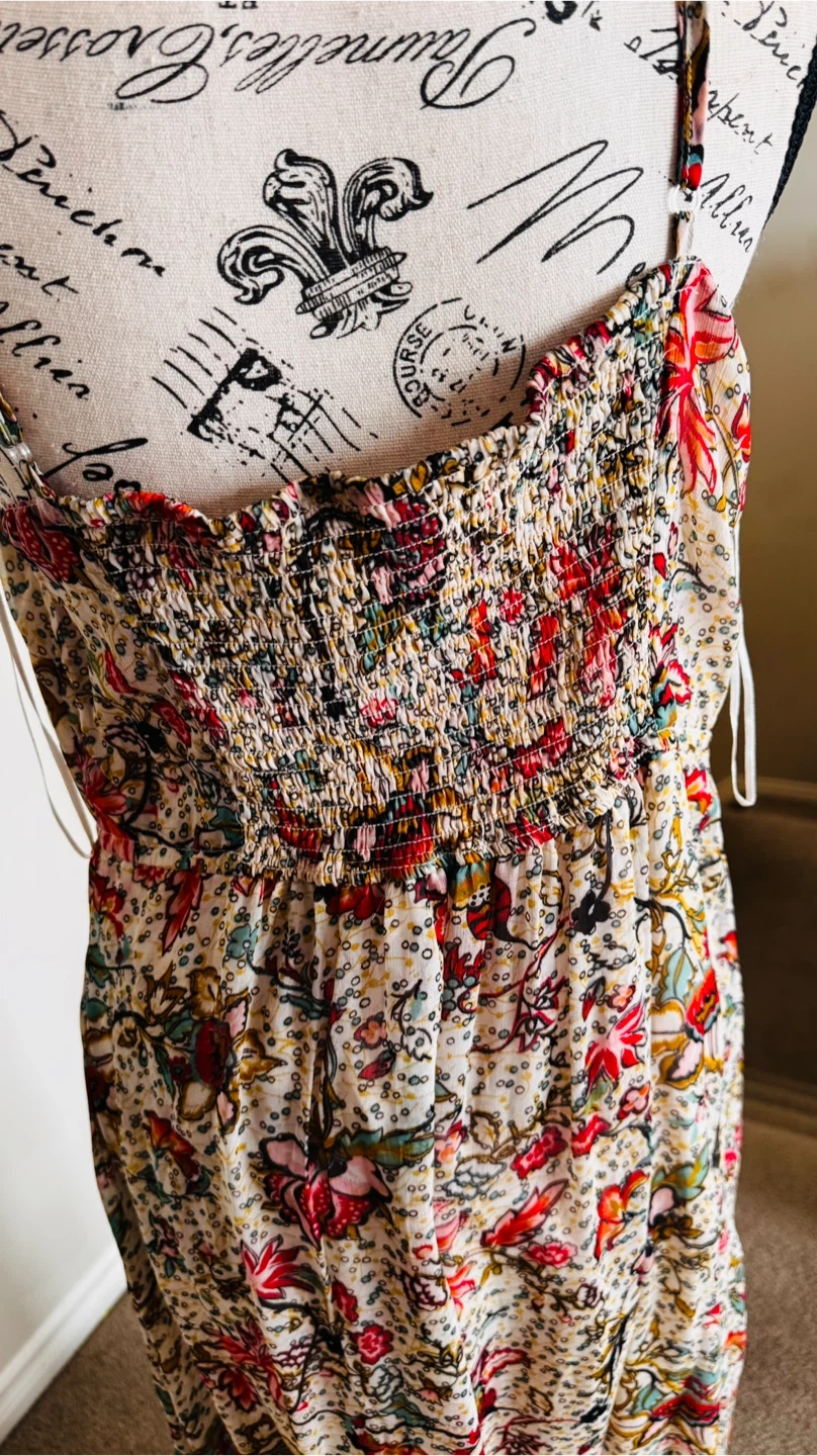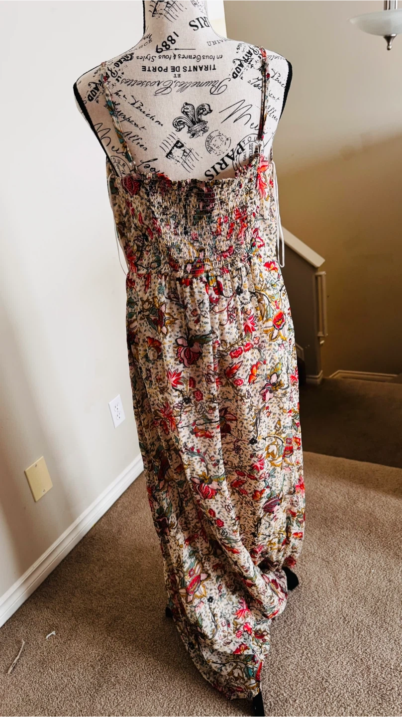 Selling a cute floral print maxi dress. The dress has a smocked bodice and adjustable straps. The length from the top of the bodice to the bottom hem is about 49 inches