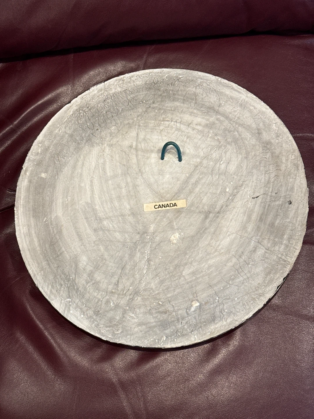 This substantial decorative wall plaque features a high-relief carving of an Inuit family with dogs in front of an igloo. It's made to resemble soapstone-and is a reproduction of Karl Rothammer’s original wood carving. Includes a hanger on the back. A label on the back indicates 'Canada'. This piece is a unique addition to any home decor collection.