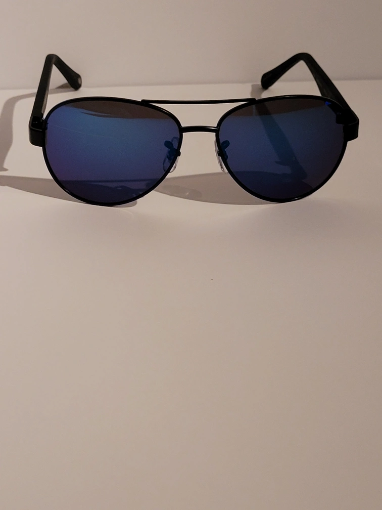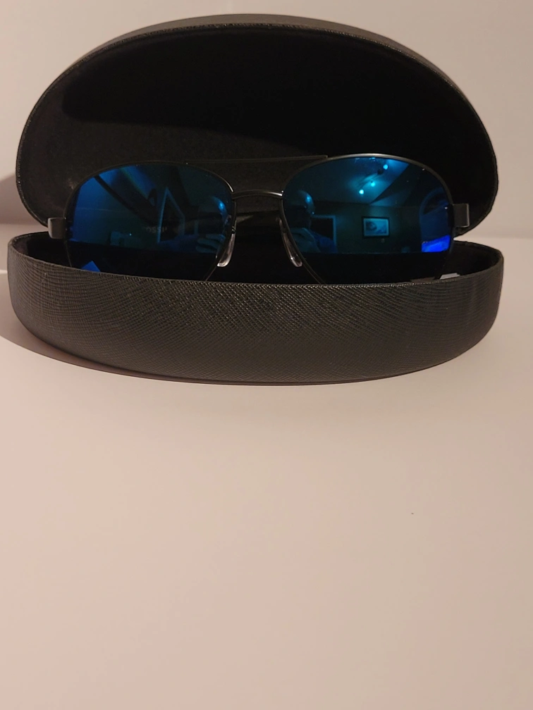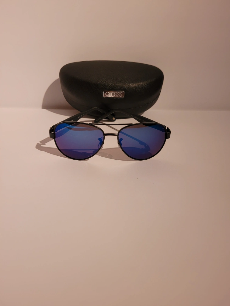 Black framed sunglasses with blue lenses and a Guess hard case. The store didn't have a hare case for them, so I bought ome that the sunglasses would fit into. Never worn. Can be worn by both men and women. Reasonable offers are welcome.