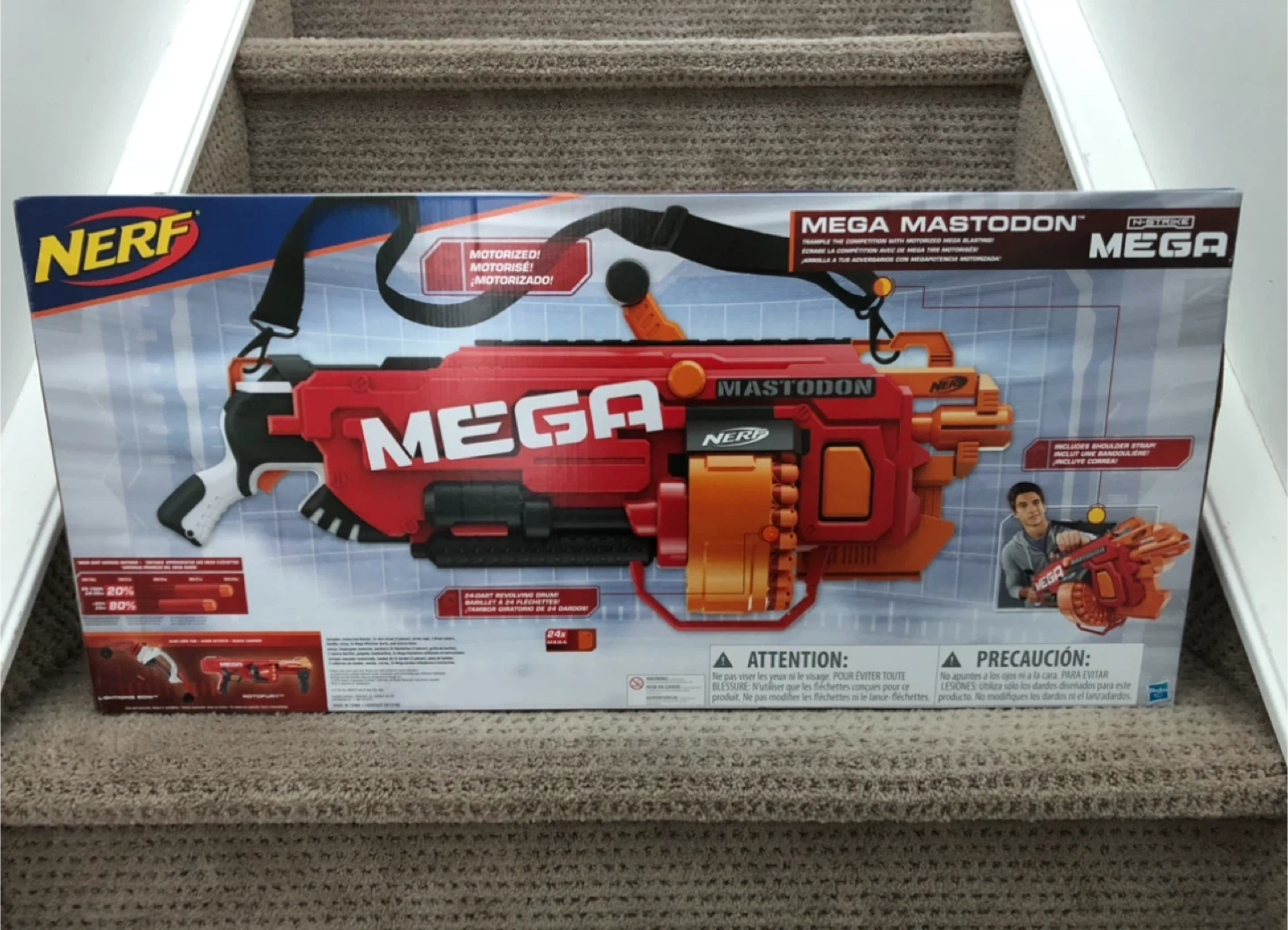 Selling a brand new, in-box Nerf N-Strike Mega Mastodon blaster! This motorized blaster features a revolving drum that holds 24 Mega darts. It's recommended for ages 8+. Get ready for some mega blasting fun!