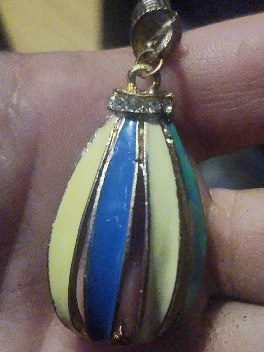 Here's a colourful pendant charm featuring blue, yellow, and green stripes. It has a gold-tone metal frame and a decorative rhinestone accent at the top. Perfect for adding a pop of colour to your jewellery collection!