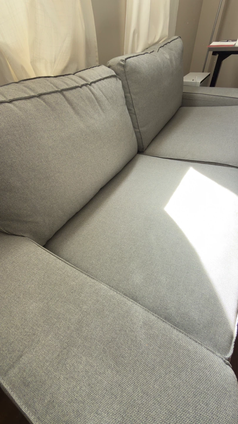 This is a light grey two-seater sofa. It's upholstered in a durable fabric with a subtle herringbone pattern. The sofa features comfortable seat and back cushions with piping detail. It's a nice addition for any living space!