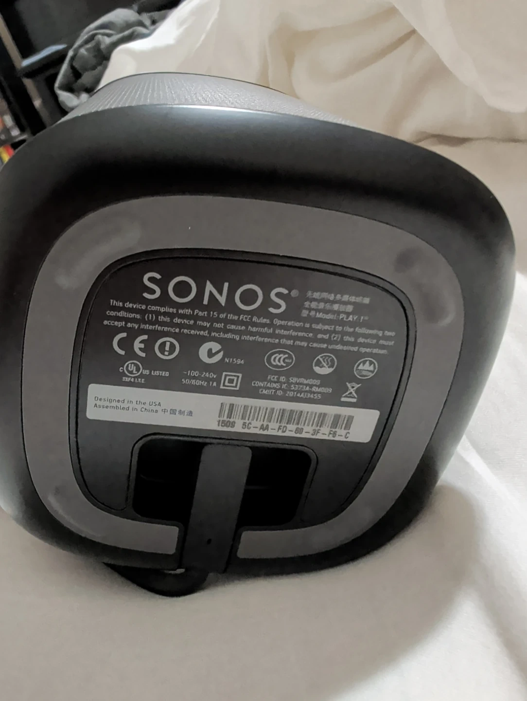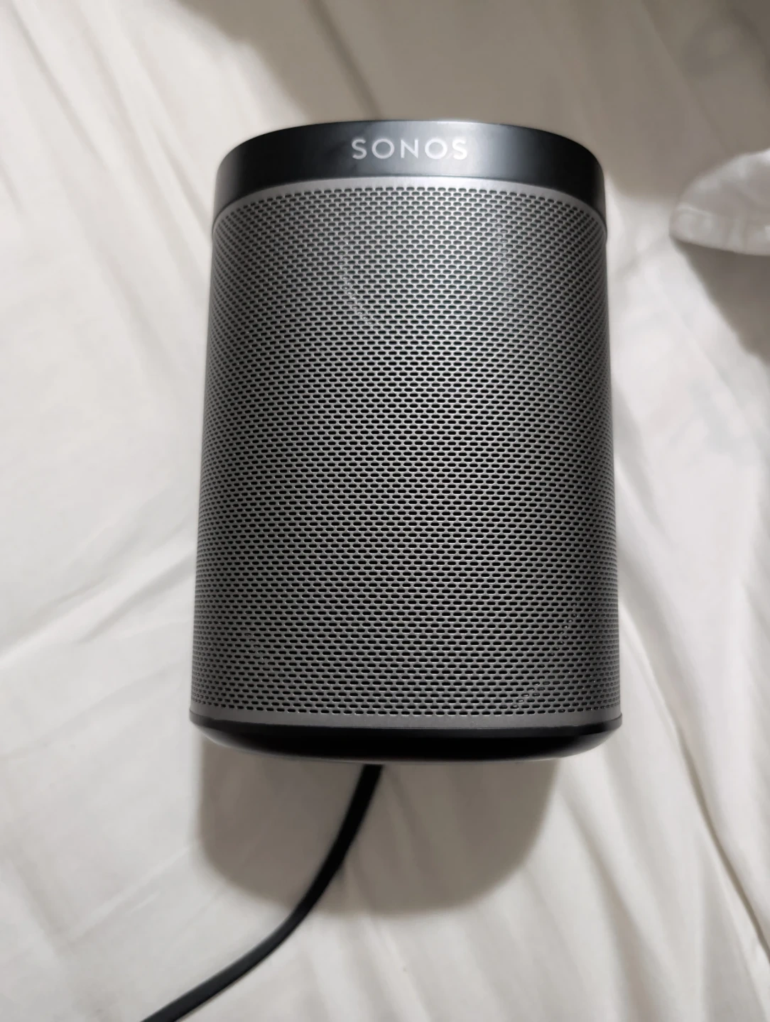 Sonos PLAY:1 smart speaker in black. Compact design with excellent sound. Connects via Wi-Fi and Ethernet. Includes power cord.