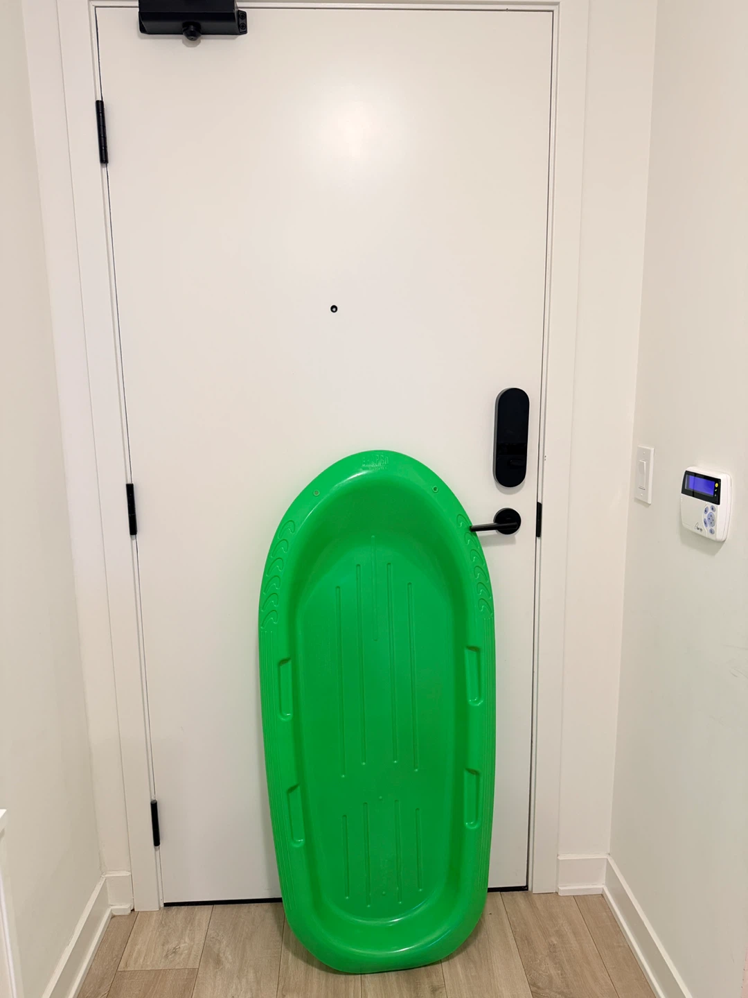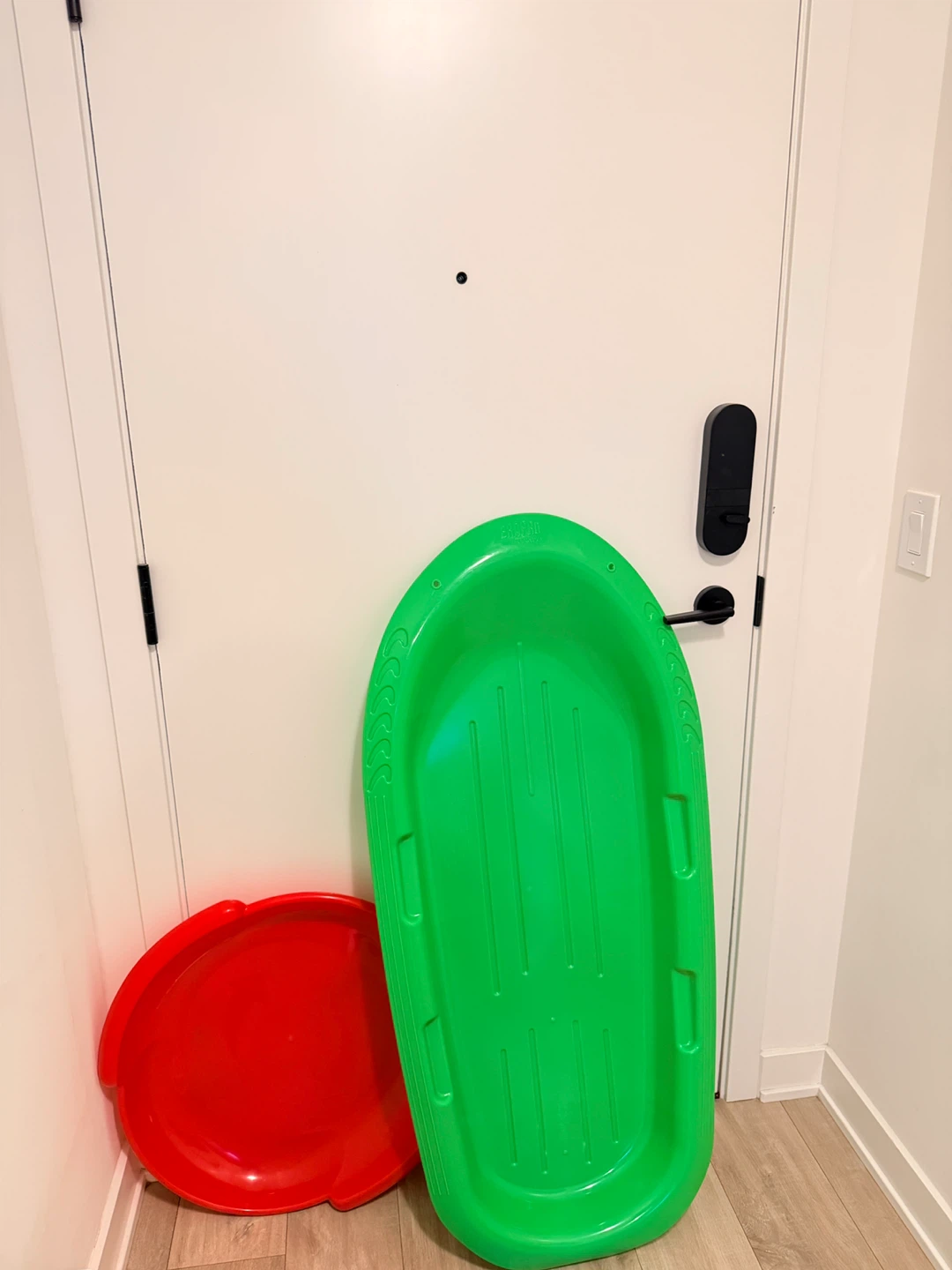 The green one is the Best Toboggan Snow Sled from Amazon selling at 49.99cad each plus tax: