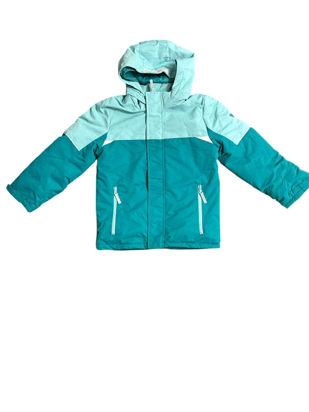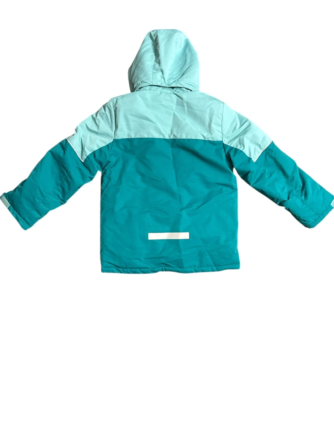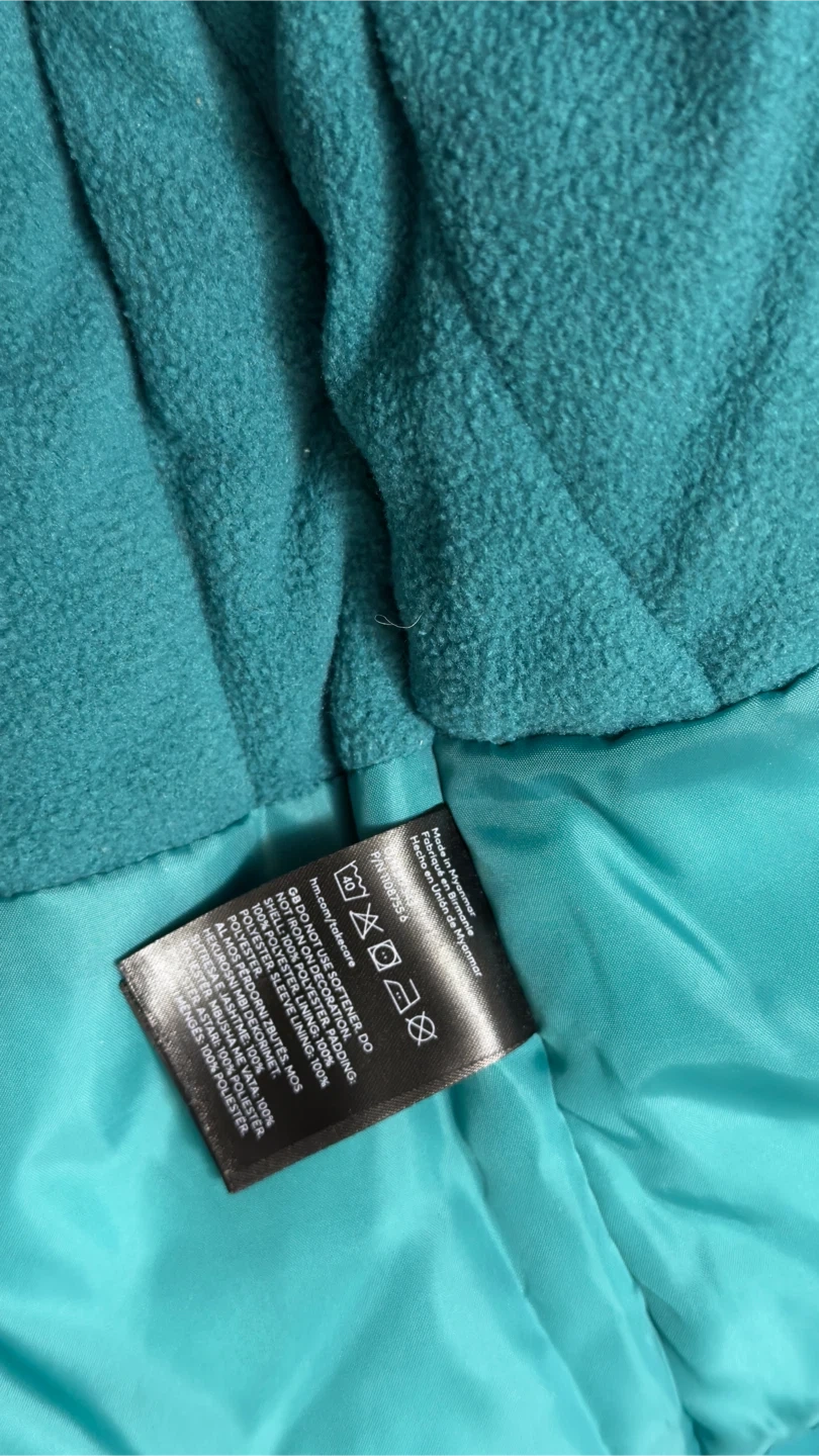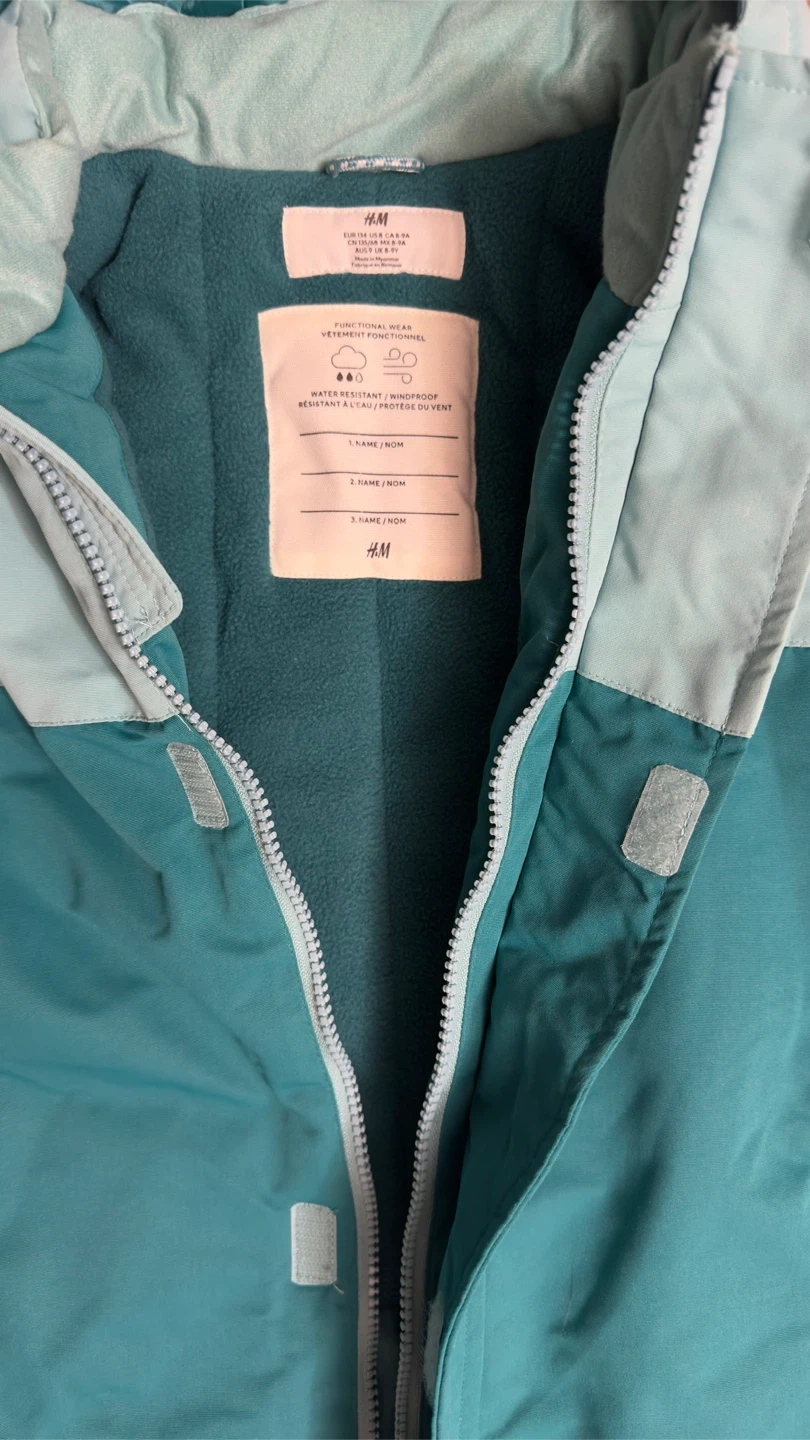 This H&M kids' winter jacket is teal and light blue. It's made with a water-resistant and windproof outer shell and a soft fleece lining. Perfect for keeping your child warm and dry during colder months!