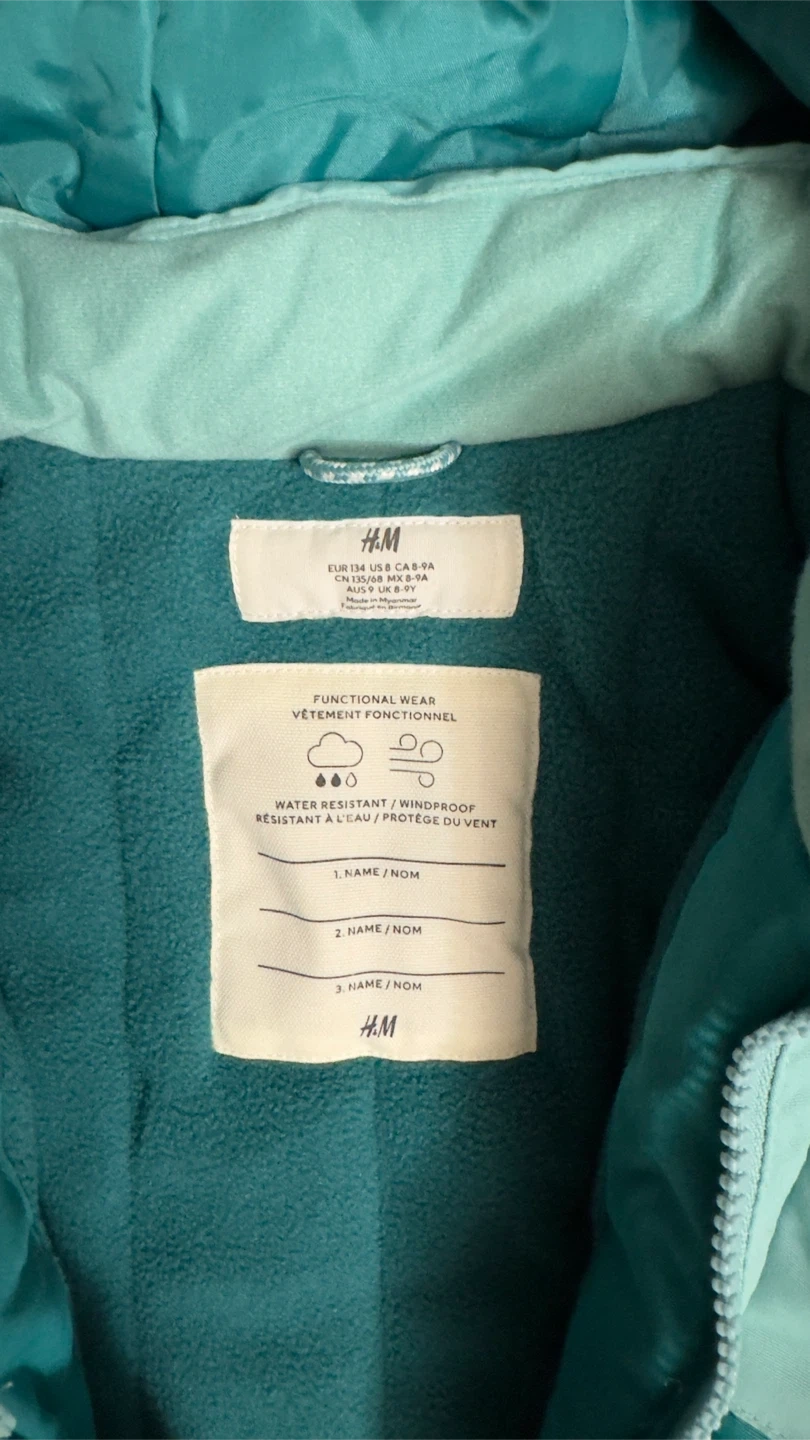 This H&M kids' winter jacket is teal and light blue. It's made with a water-resistant and windproof outer shell and a soft fleece lining. Perfect for keeping your child warm and dry during colder months!