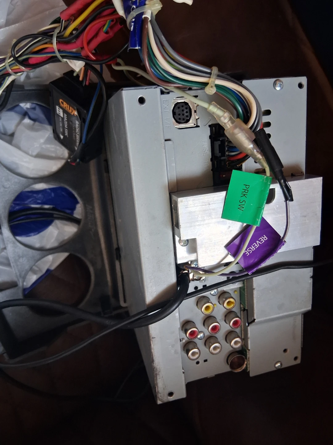 Kenwood in-dash car receiver with a 6.1-inch touchscreen display. Includes wiring harness and mounting cage. Unit has RCA outputs for amplifiers and a reverse camera input.