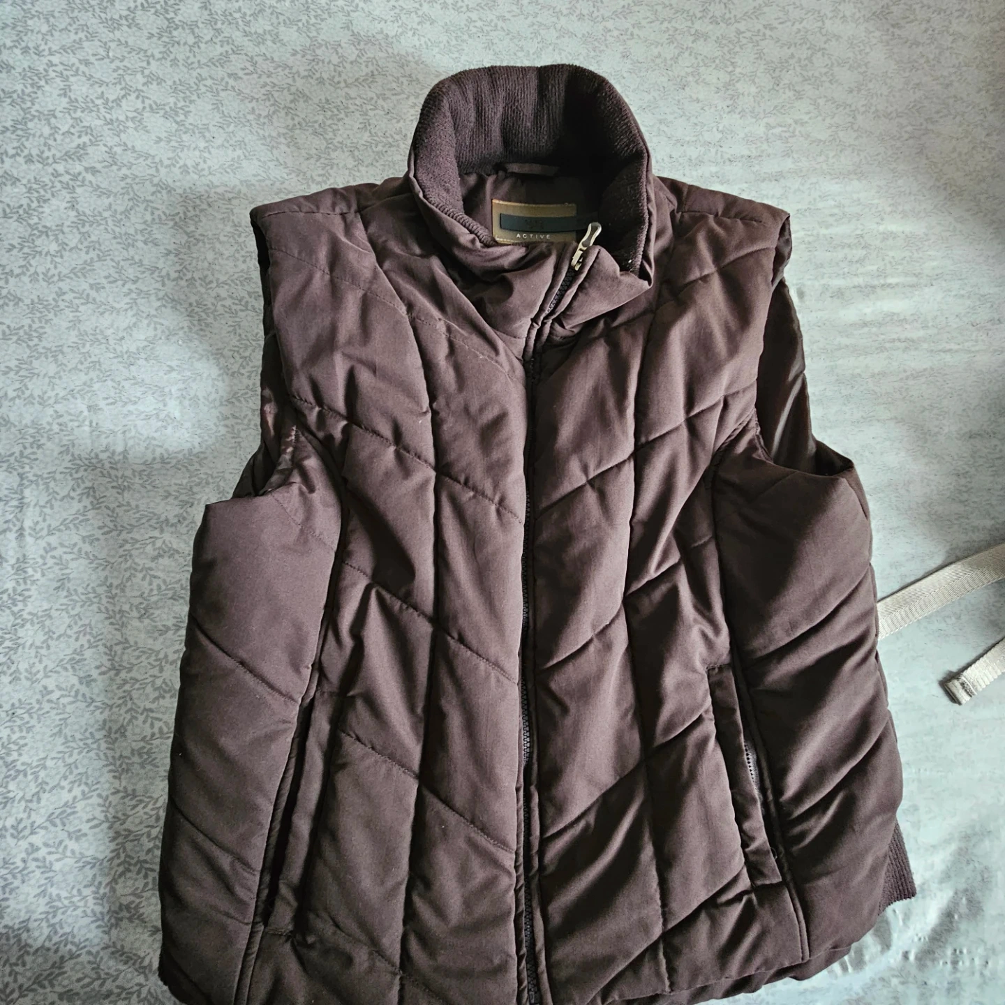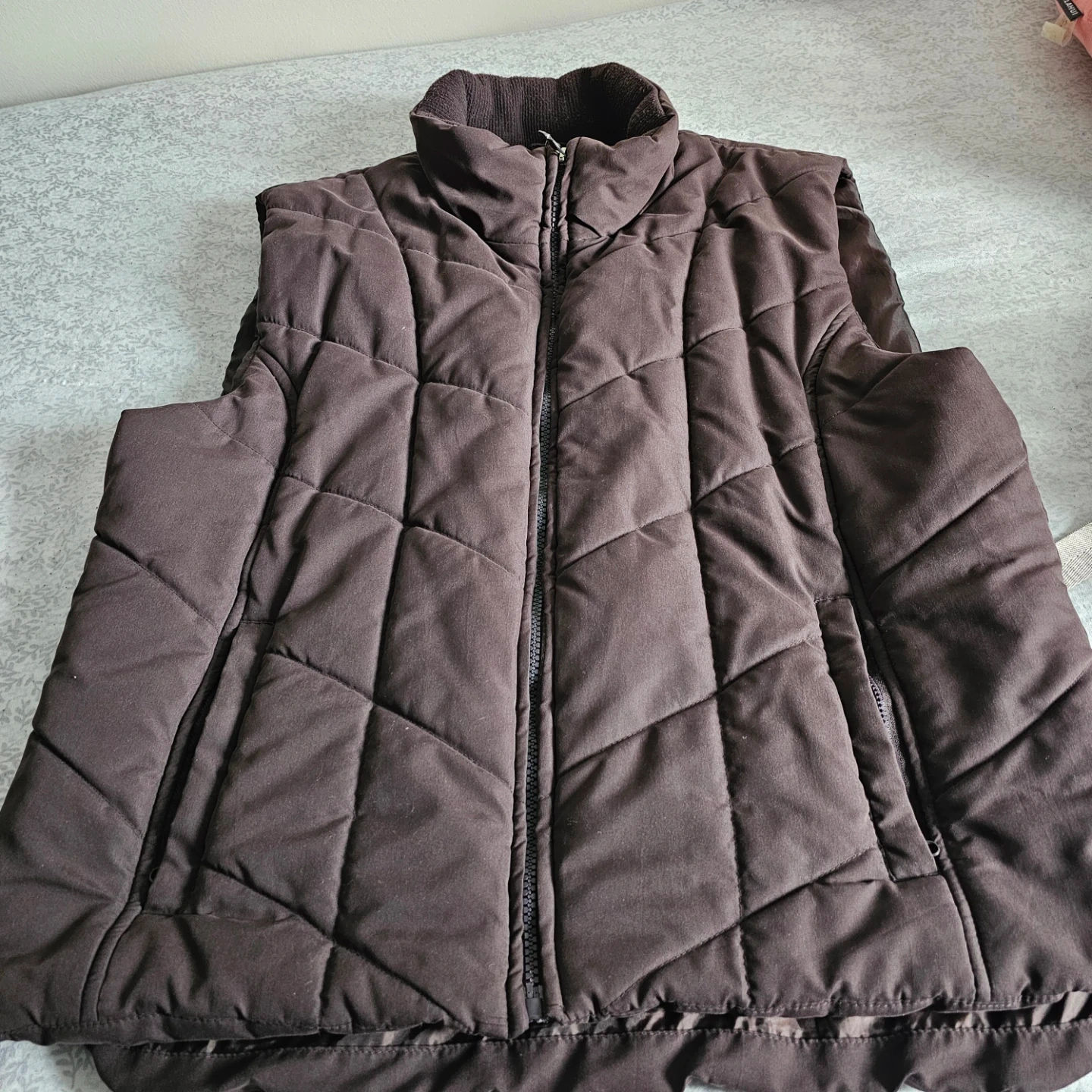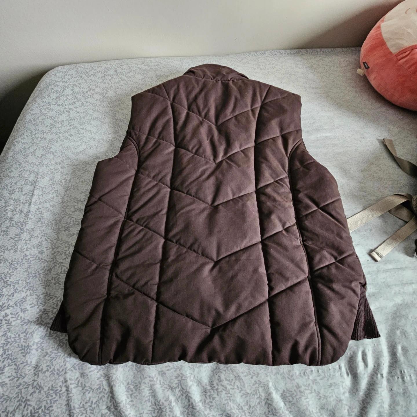 Brown quilted vest with a full zip front and a stand-up collar. It's a comfortable layering piece. The outer material appears to be polyester.