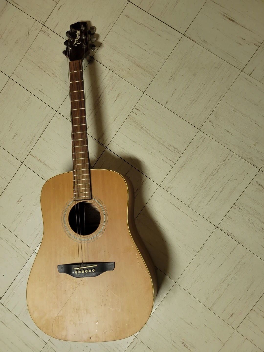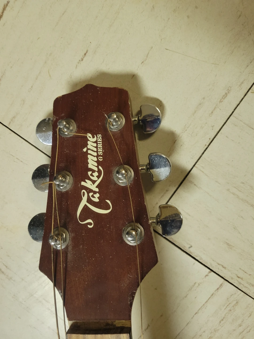 This is a Takamine G Series acoustic guitar. It's a dreadnought style with a natural wood finish. Its construction includes a wooden body and neck. This guitar would be great for beginner musicians. NEEDS STRING REPAIR