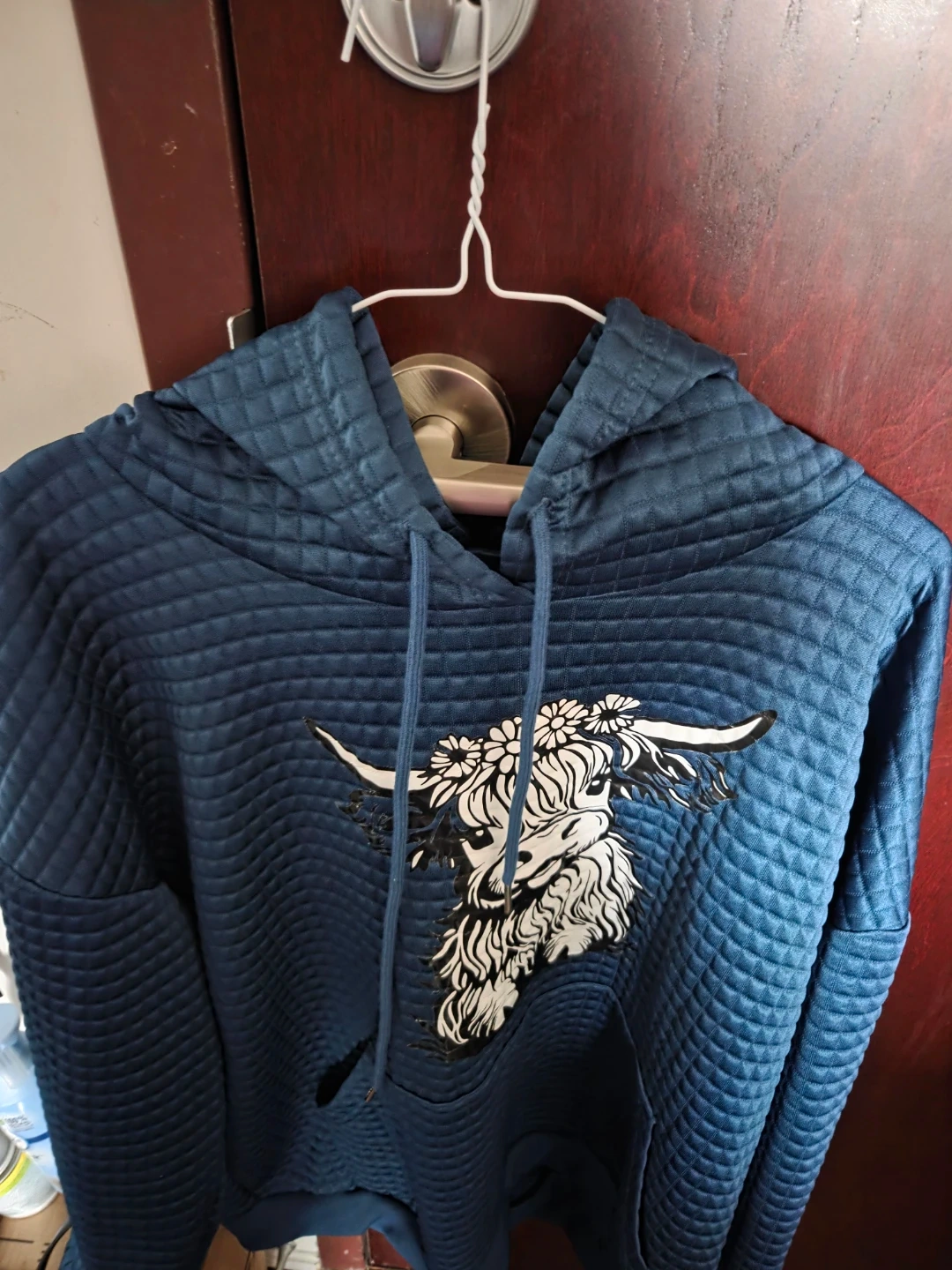 Cozy blue quilted hoodie featuring a striking Highland cow graphic. Made with 95% polyester and 5% spandex for comfort. Perfect for casual wear when the weather gets cool!