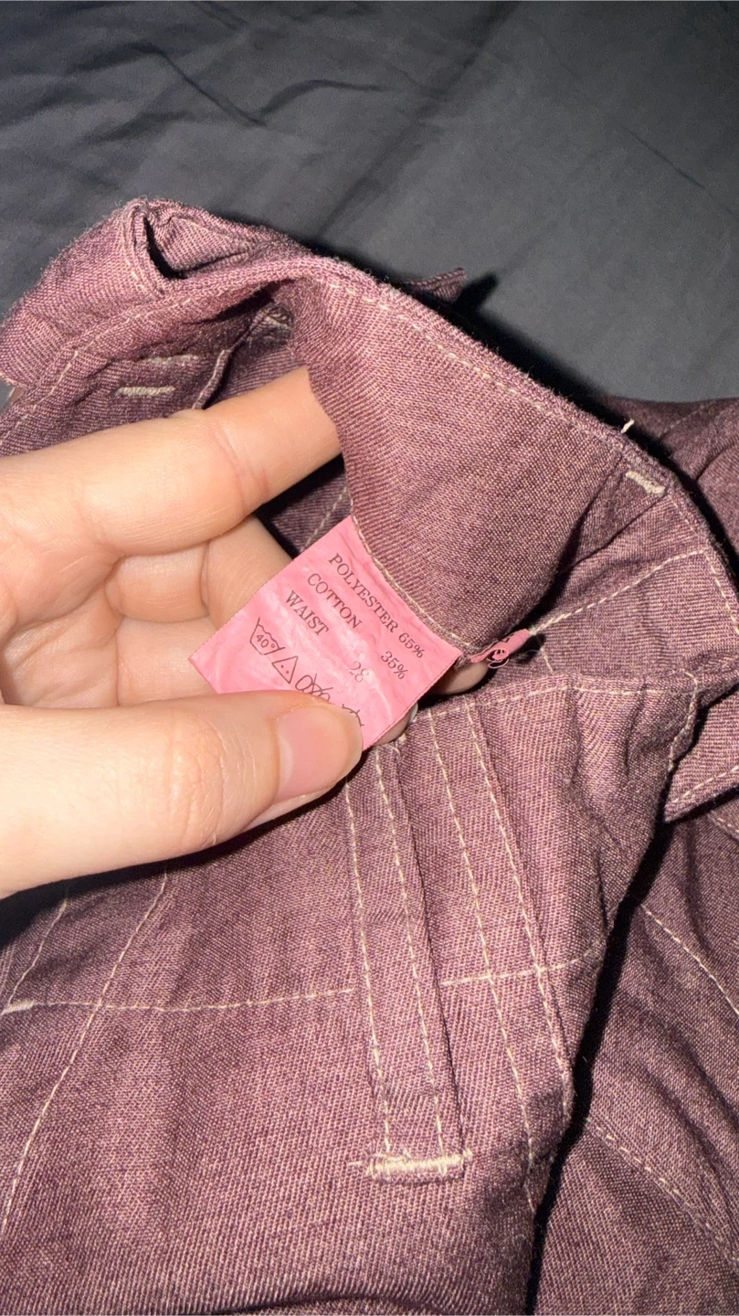 Selling a pair of maroon cargo pants. The waist size is 28. The material is 65% polyester and 35% cotton. Never worn but is second hand.