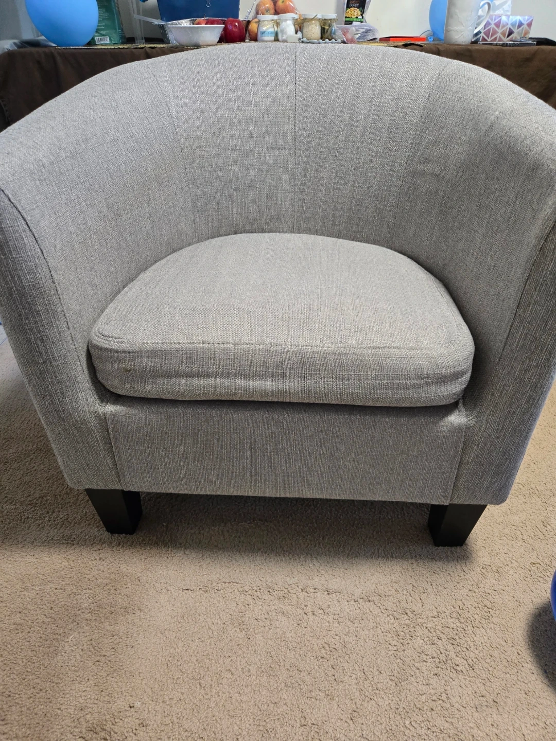 A comfortable grey fabric club chair with dark wooden legs. This chair's compact size makes it suitable for smaller spaces. It's upholstered in a textured grey fabric.