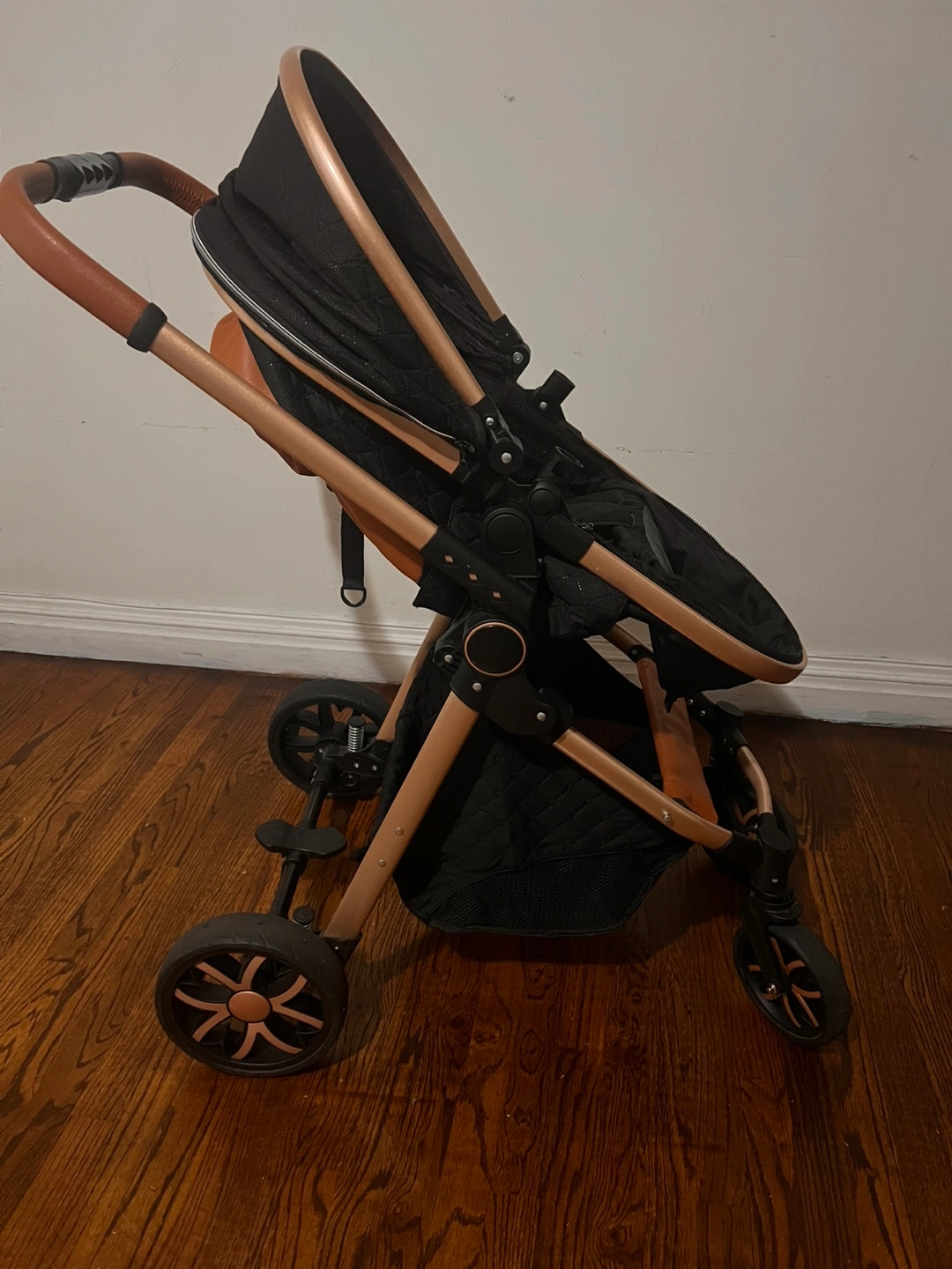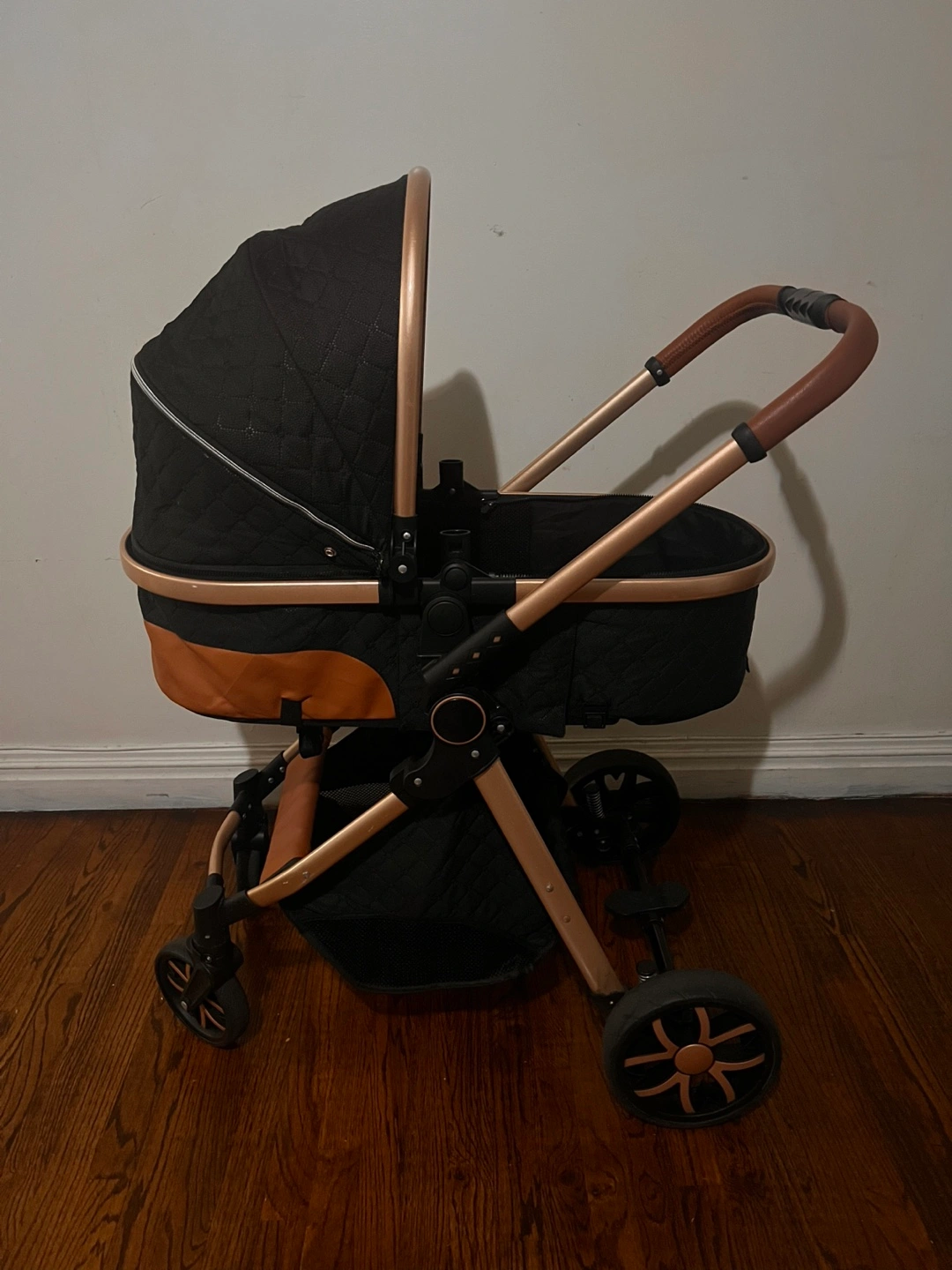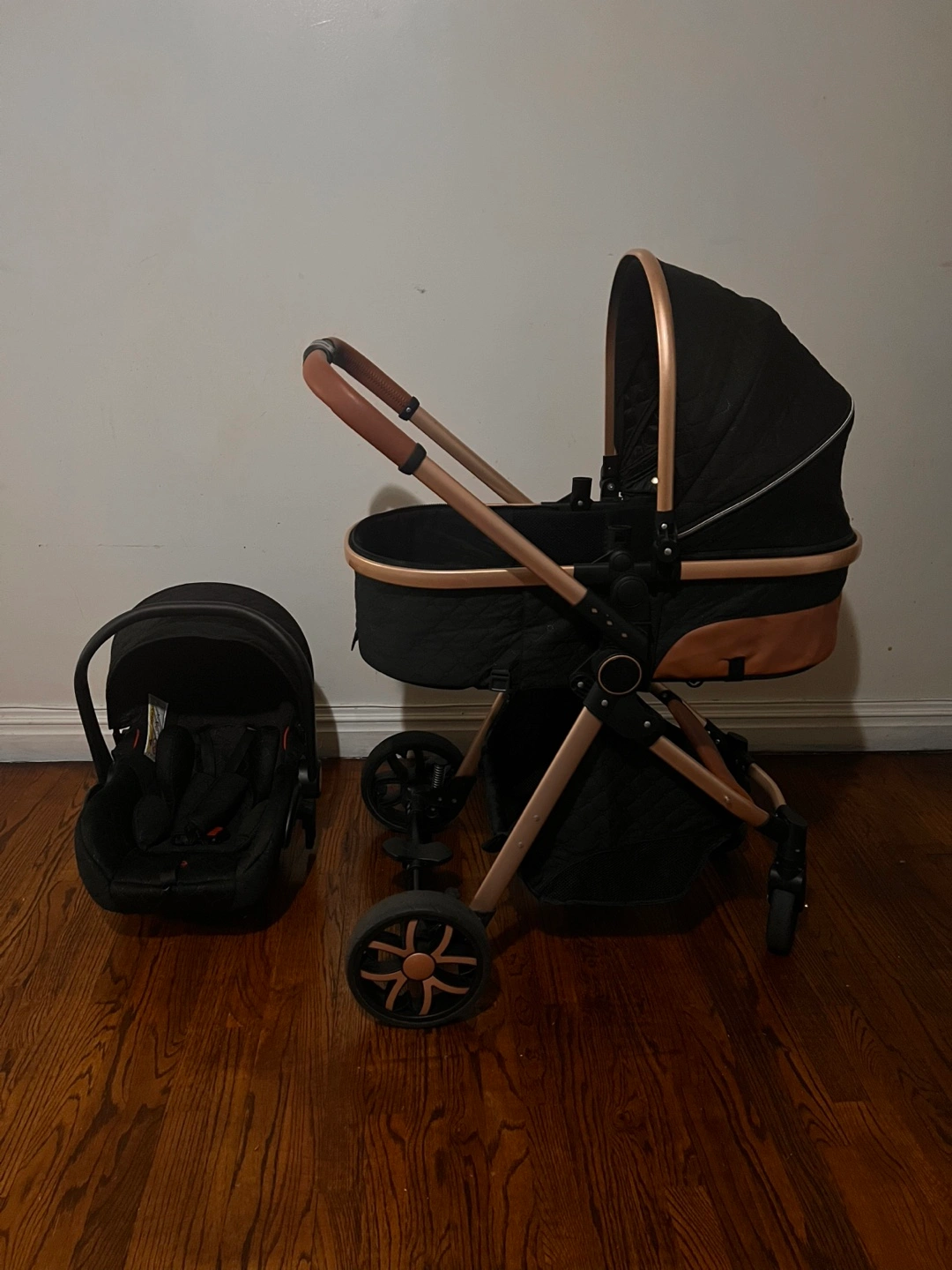 Selling a stylish stroller and car seat combo in black with gold accents. It's in great condition and ready for a new little one! The set includes both the stroller and a matching car seat, perfect for easy transitions from car to strolling