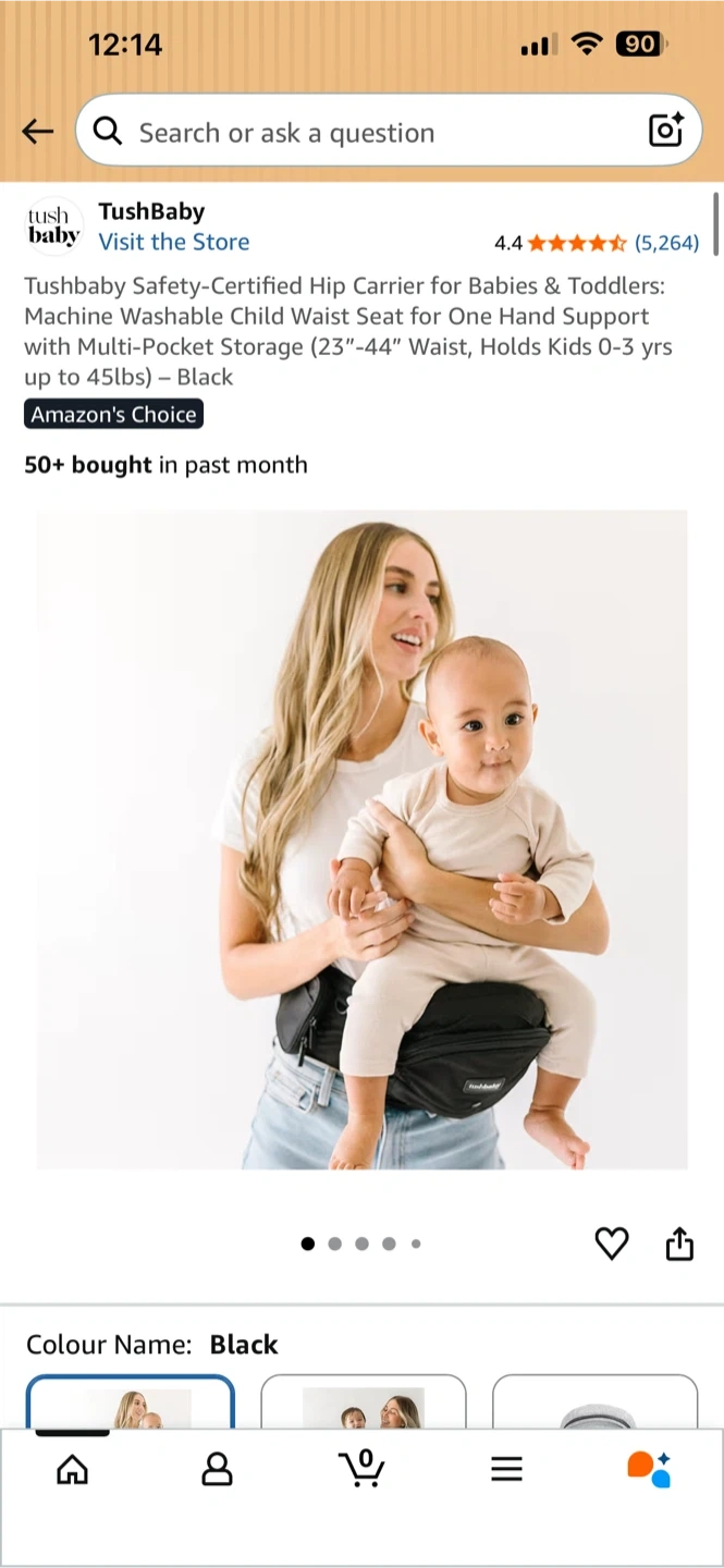 TushBaby safety-certified hip carrier for babies and toddlers. Machine washable child waist seat for one-hand support with multi-pocket storage. Holds kids 0-3 years up to 45 lbs. Waist size 23"-44".