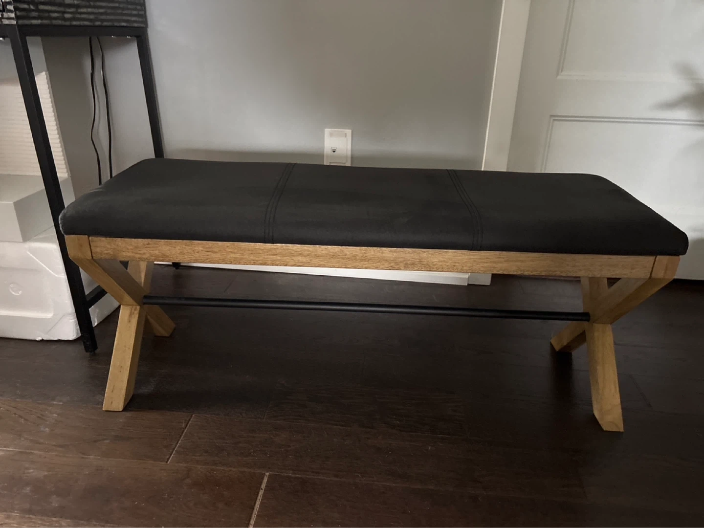 A stylish bench with a black faux leather seat and a natural wood frame featuring unique X-shaped legs. It has a sturdy metal support bar connecting the legs for added stability. This bench is perfect for an entryway or at the foot of a bed.