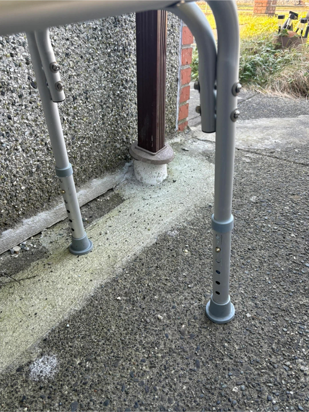 This is a sturdy white shower chair with a backrest and adjustable legs. It features a comfortable, non-slip seat with drainage holes. It's great for added stability and safety in the shower or bathtub.