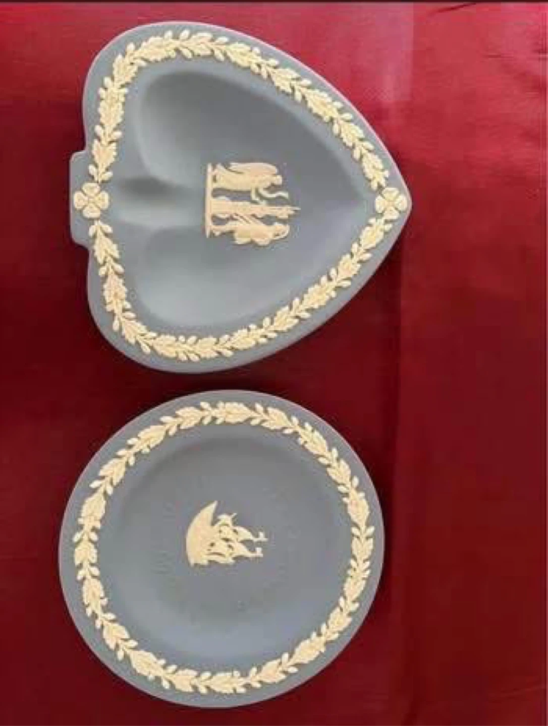 Two Wedgwood Blue Jasperware trinket dishes. One is round and features the Mayflower. The other is heart-shaped. Made in England. Collectible items.