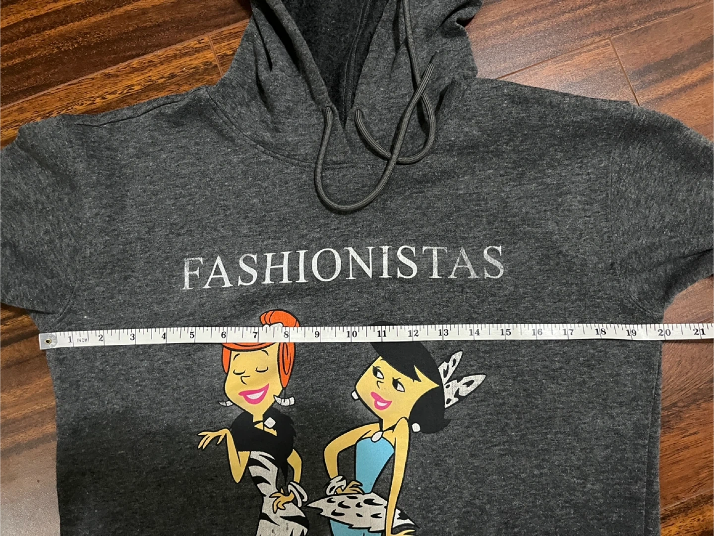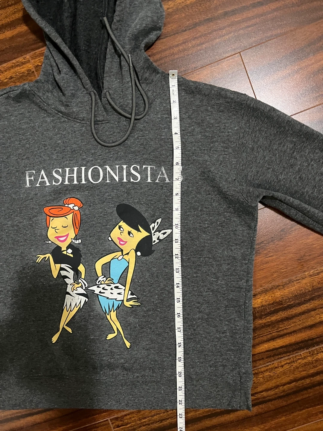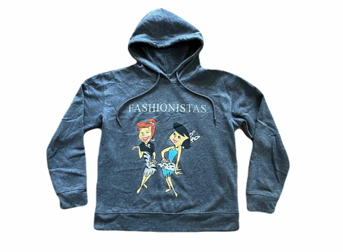 Women’s small licensed The Flintstones hoodie in grey with Wilma Flintstone and Betty Rubble ‘Fashionistas’ graphic. Pullover with drawstring hood. Excellent condition. 65% polyester, 35% cotton.