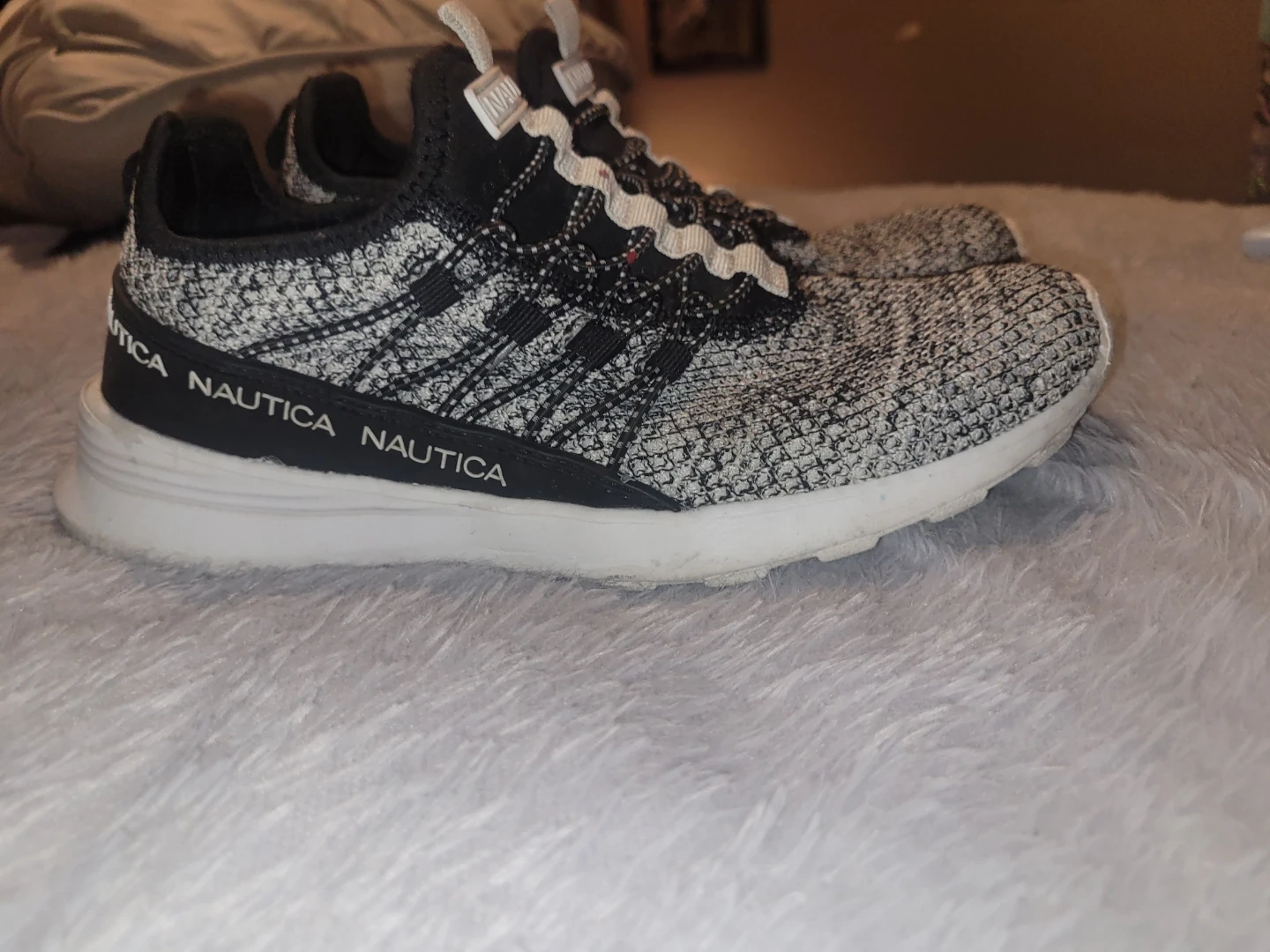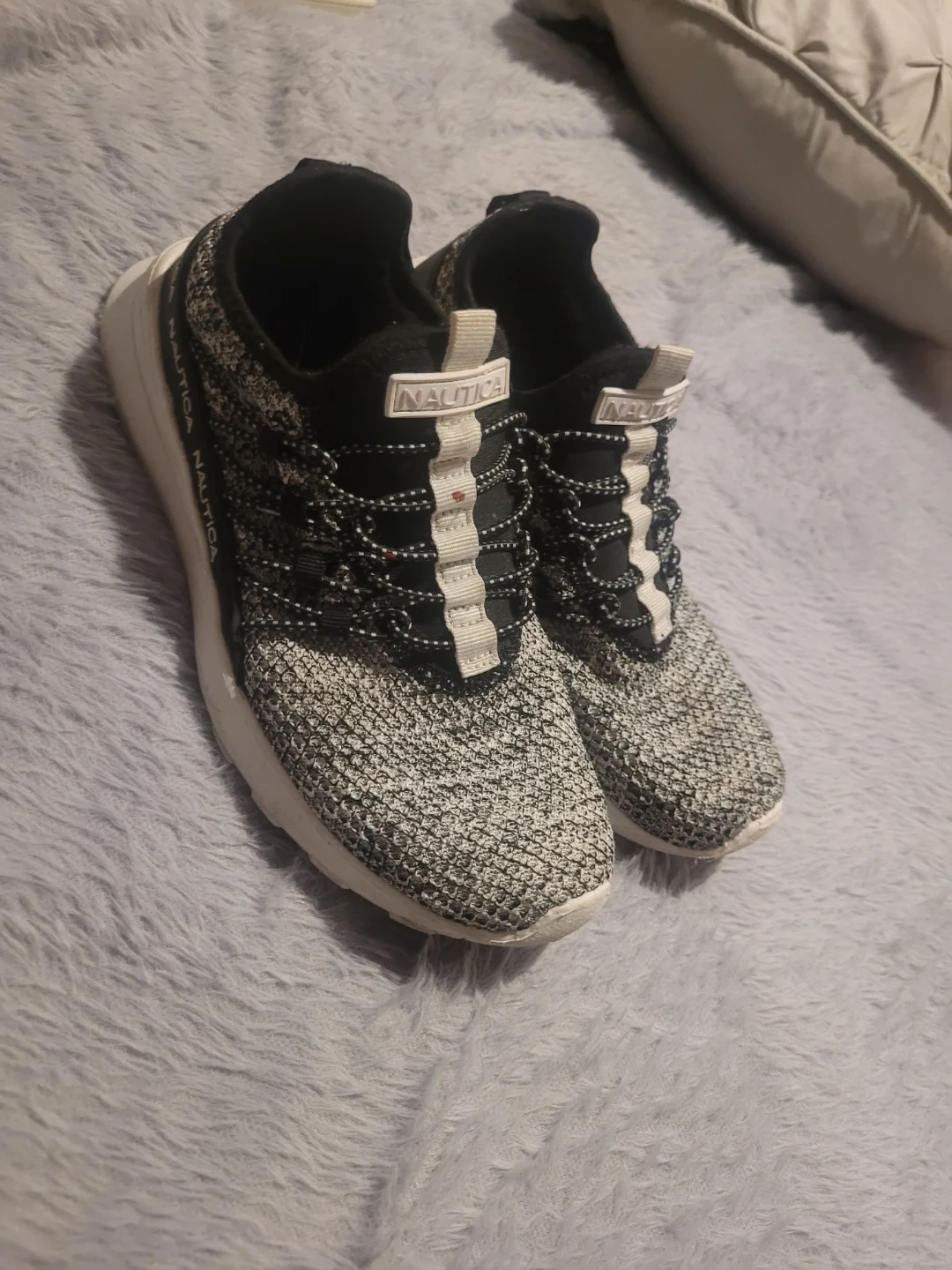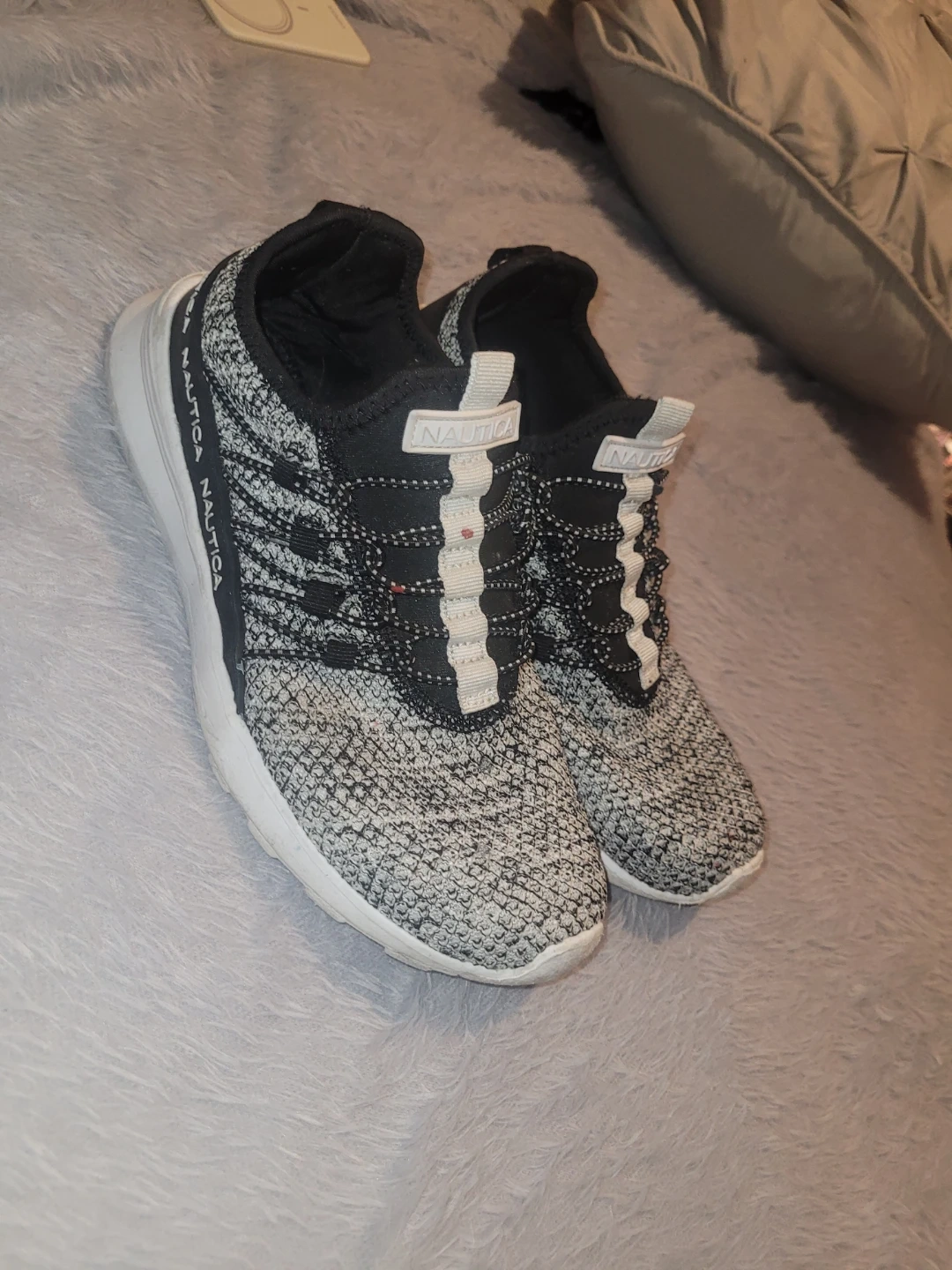 These Nautica sneakers are a stylish black and white knit. They feature a slip-on design with elastic laces. Great for everyday wear!