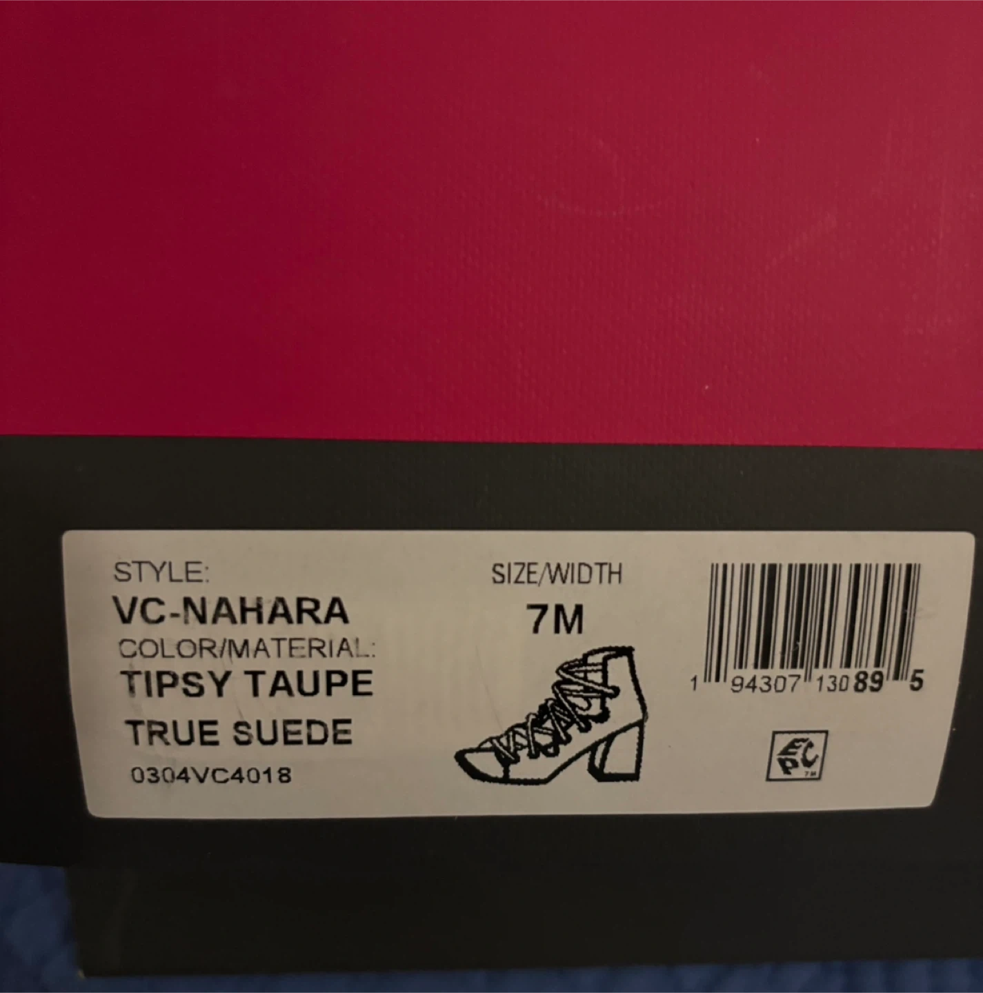 These Vince Camuto Nahara heels are made of true suede in a tipsy taupe color. They feature a lace-up front and a block heel. Size 7M.