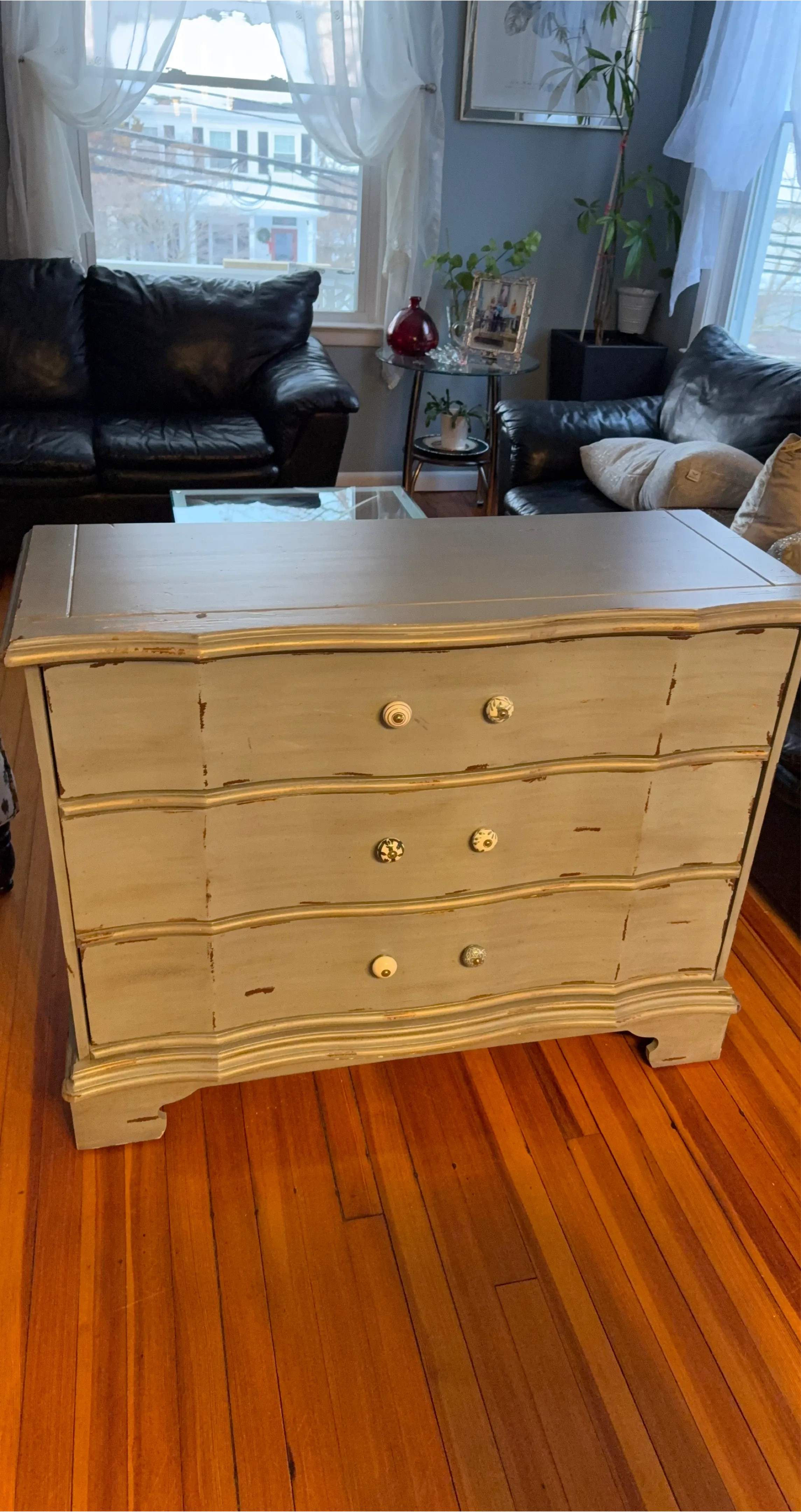 This charming distressed chest features three drawers for storage. It has a light blue painted finish with gold accents and decorative knobs. The piece has a curved front and decorative base.