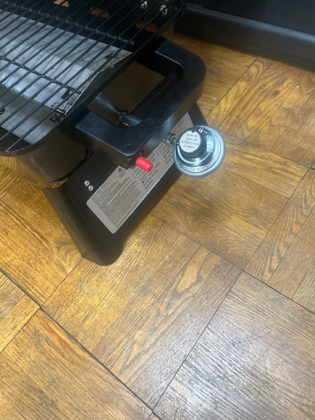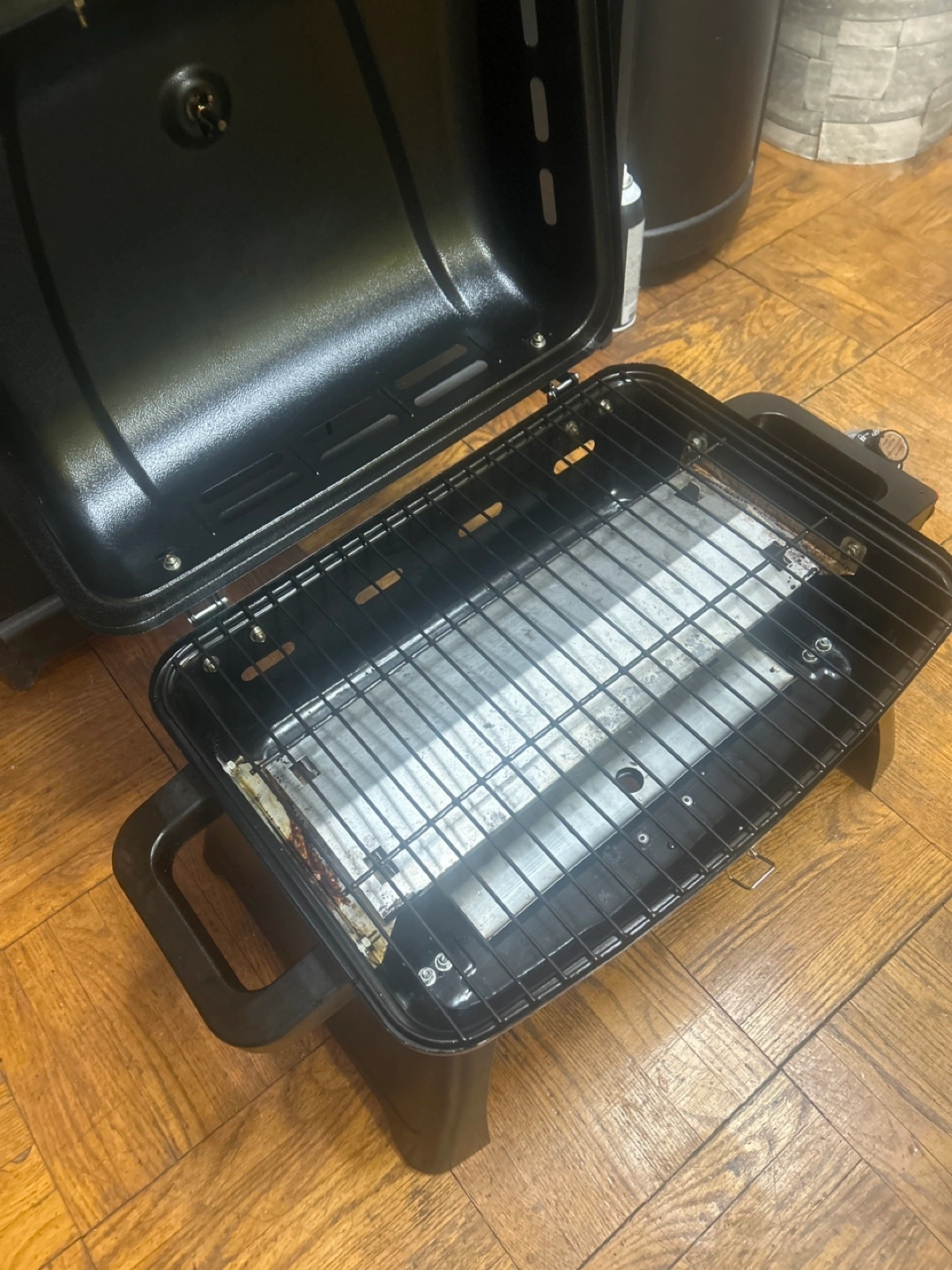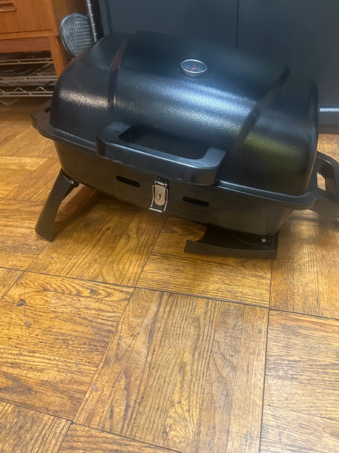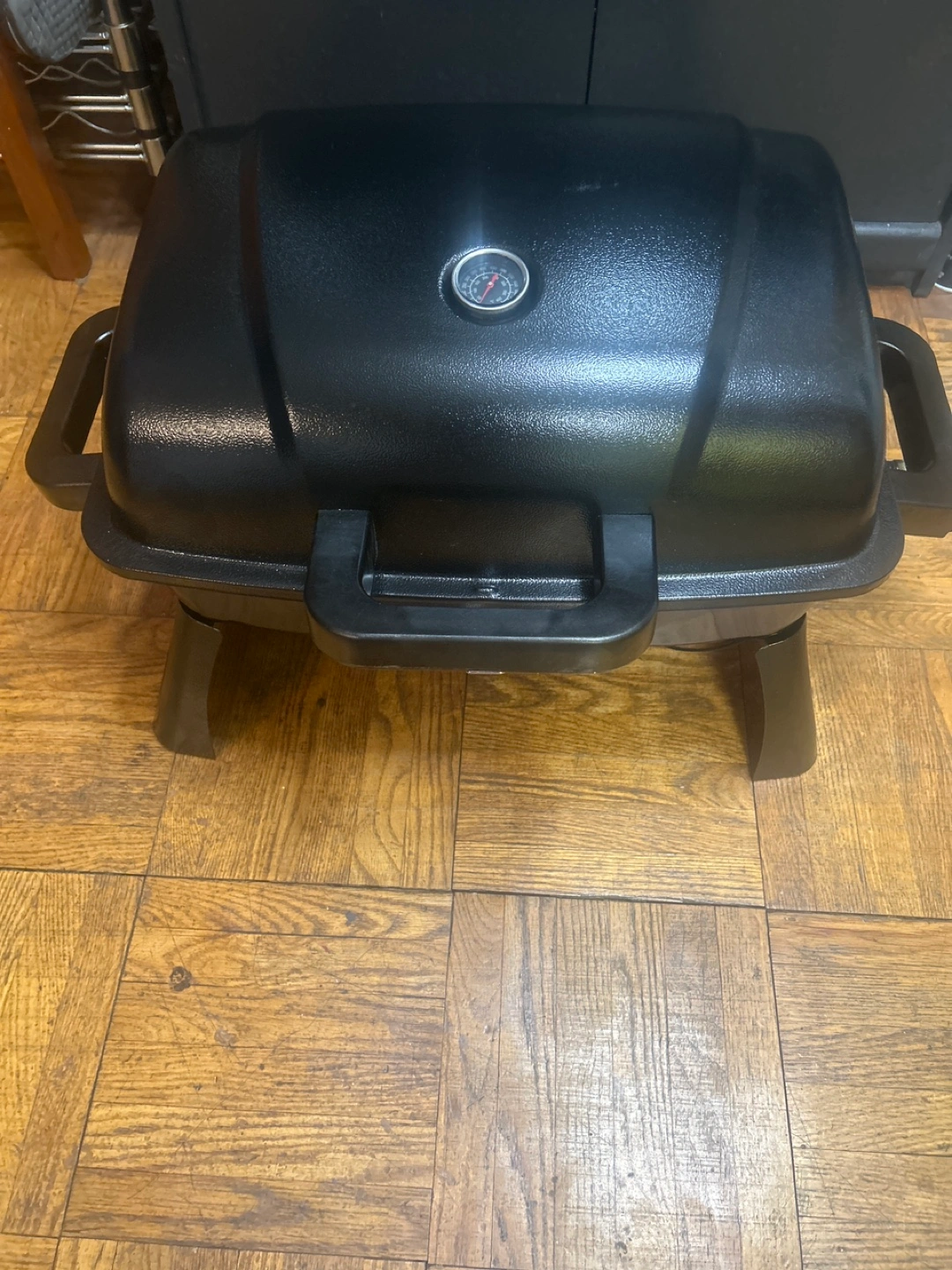 Black portable gas grill. Features a built-in thermometer and foldable legs. Small and convenient for patios or balconies. Used once electric starter comes with hamburger flipper and Tongs