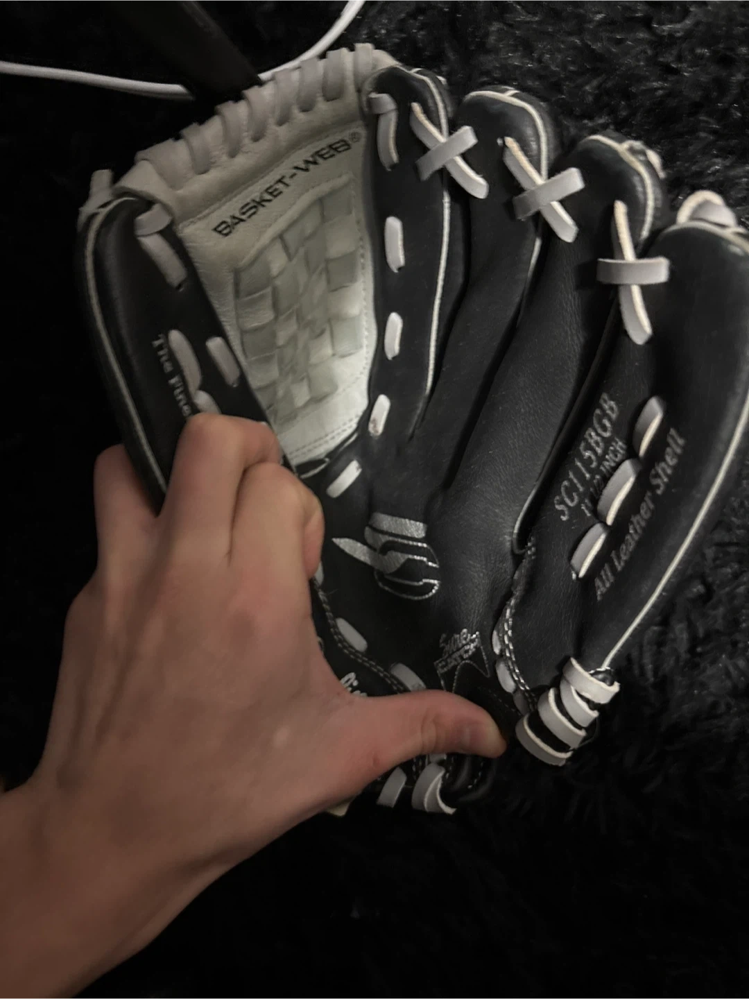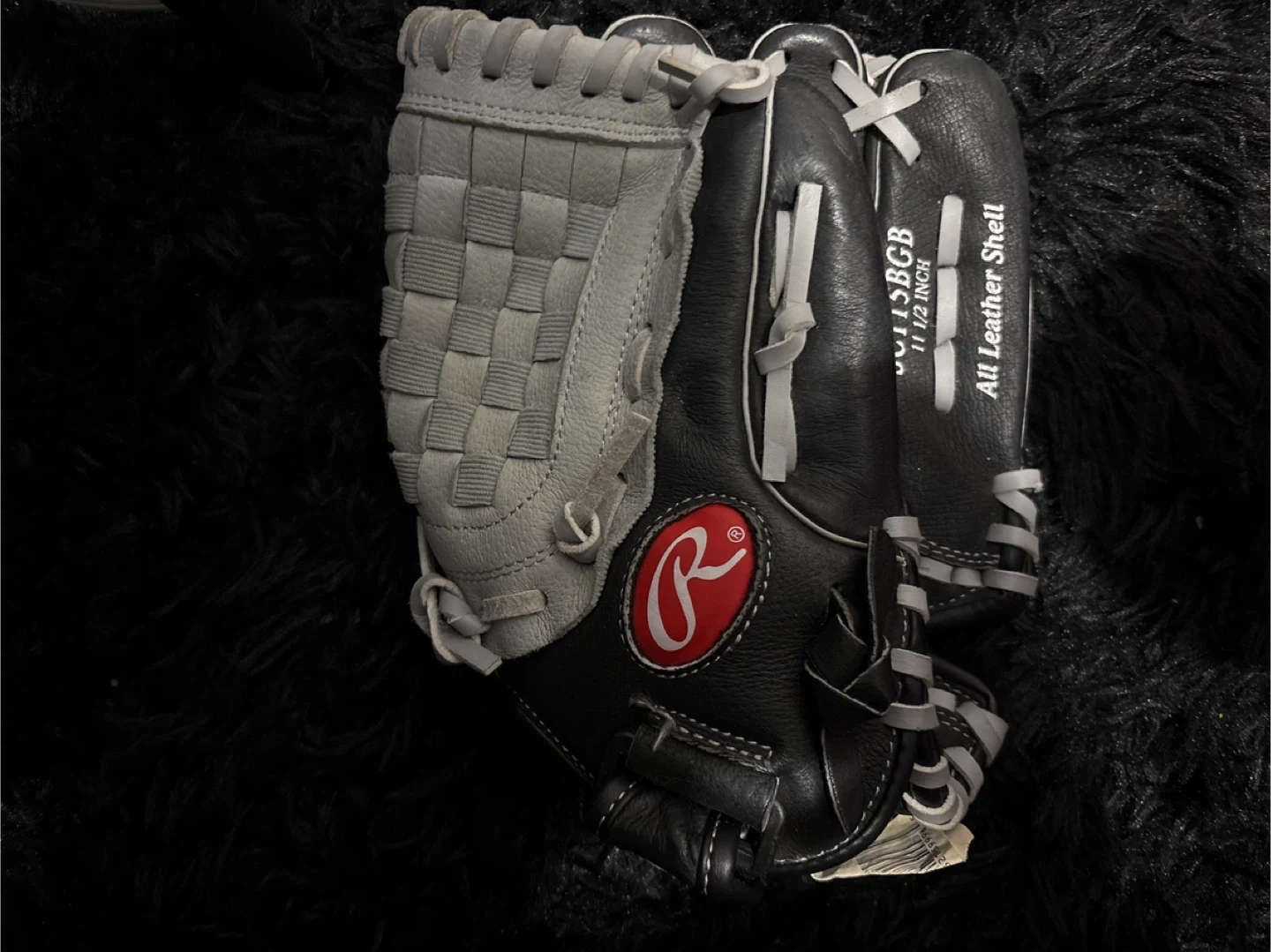 Selling a Rawlings baseball glove from The Gold Glove Co. It's a size 11 1/2 inch glove, perfect for baseball season! It is black and gray with an all-leather shell.