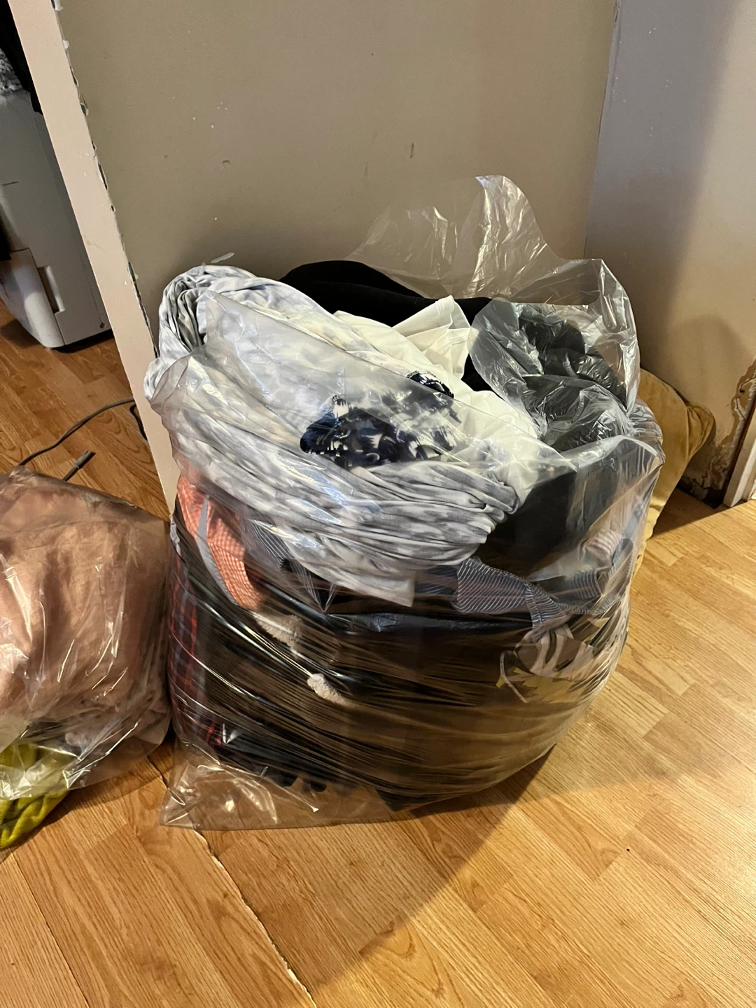 A large bag filled with various clothing items. Includes shirts, pants, and other apparel. Great for finding new wardrobe pieces!