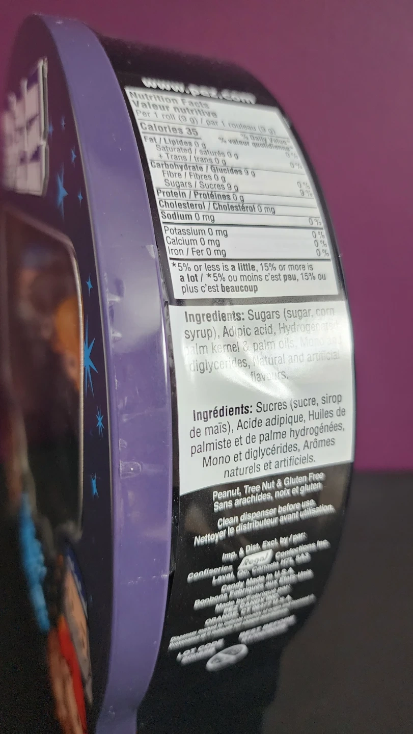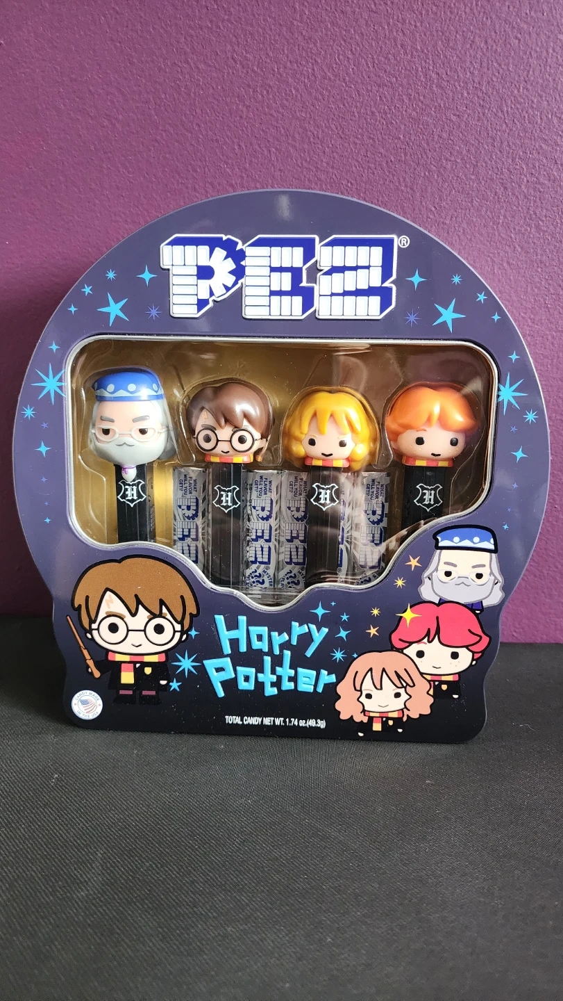 A fun 4 piece Pez set with Harry, Dumbledore, Hermoine, and Ron Weasley. The pez candy are all "mystery flavored". Back of the tin has a picture of Hogwarts. Gluten free, Peanut Free, and nut free.