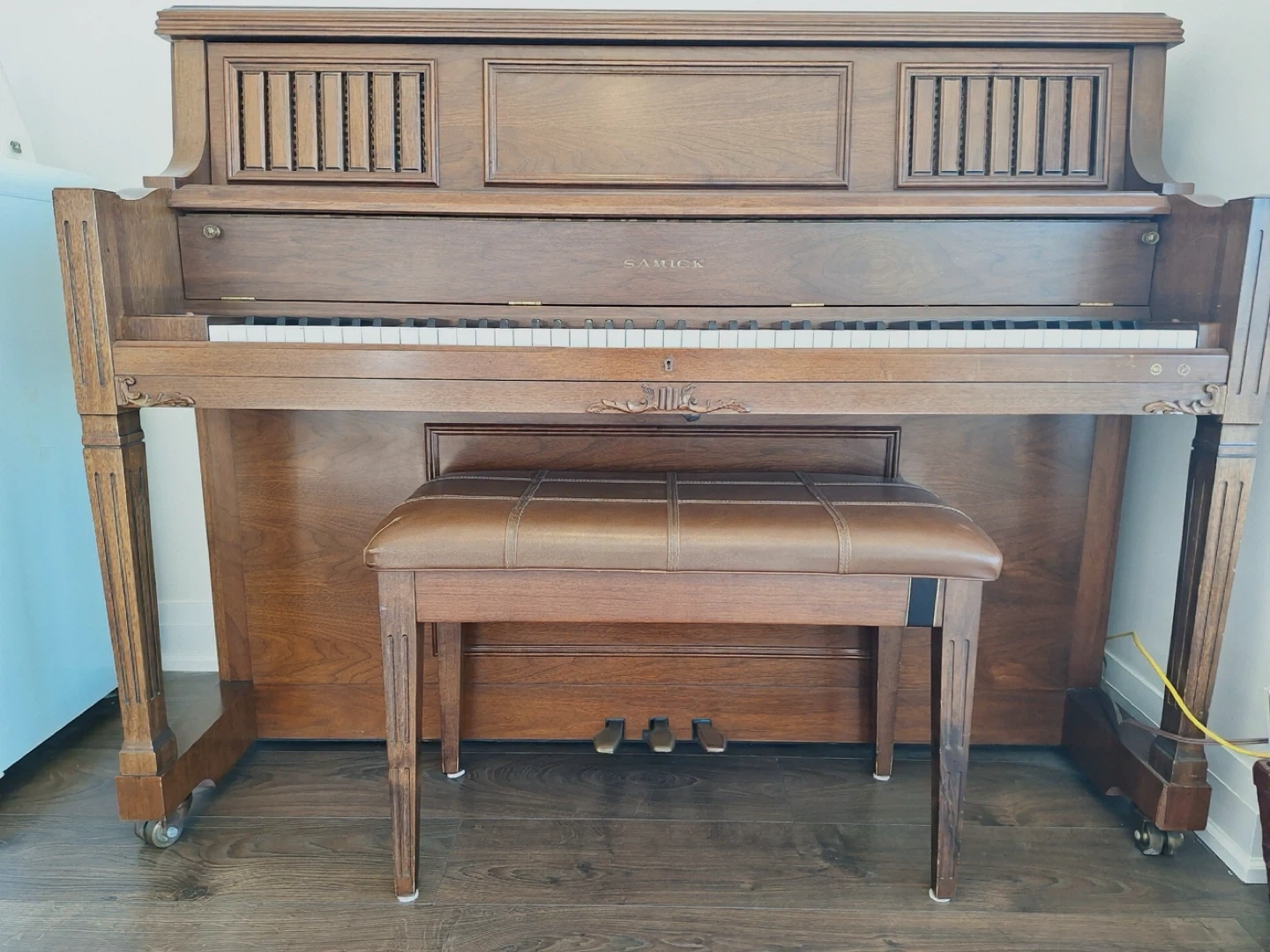 This is a Samick upright piano with a matching bench. It features a German Scale action for a rich tone. Perfect for home practice or learning music!