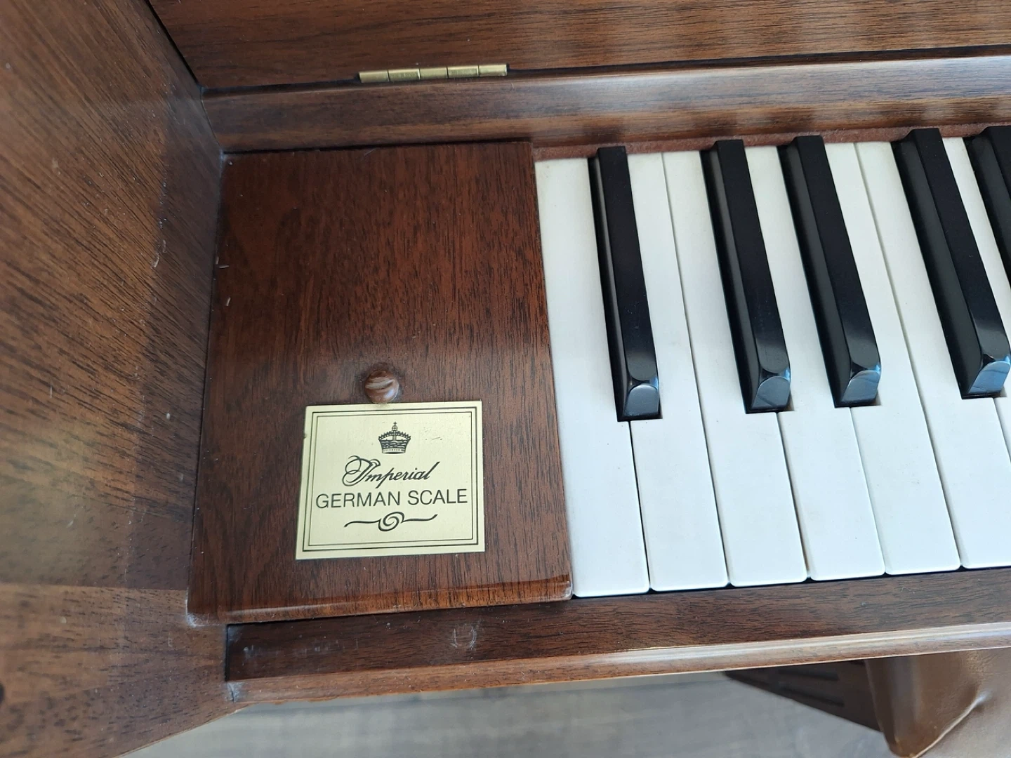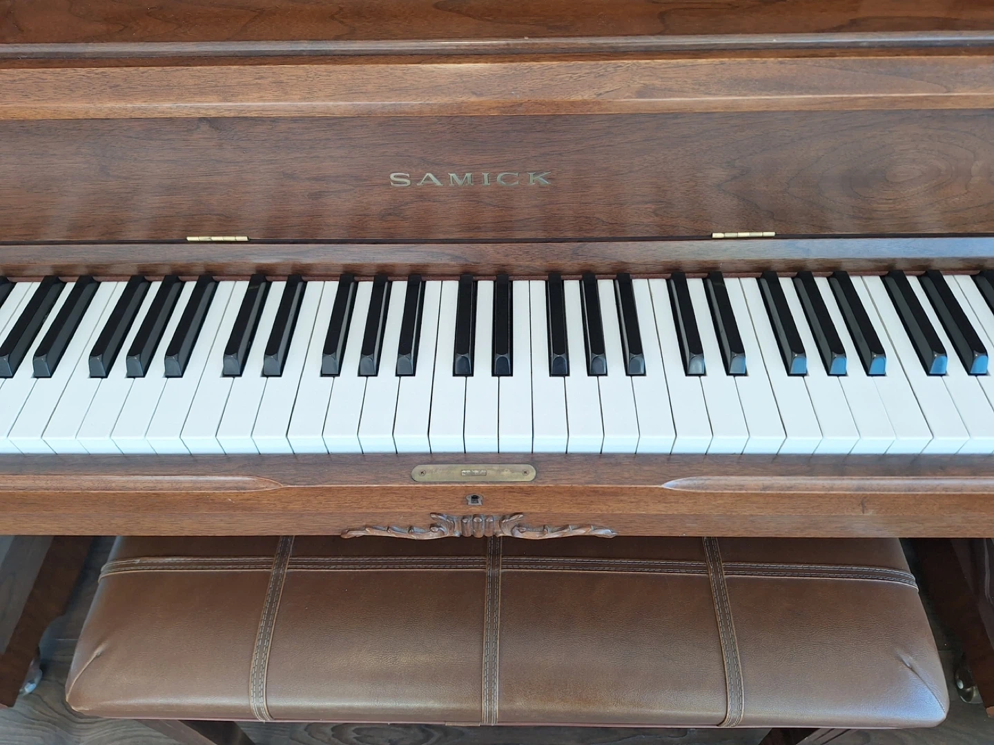 This is a Samick upright piano with a matching bench. It features a German Scale action for a rich tone. Perfect for home practice or learning music!
